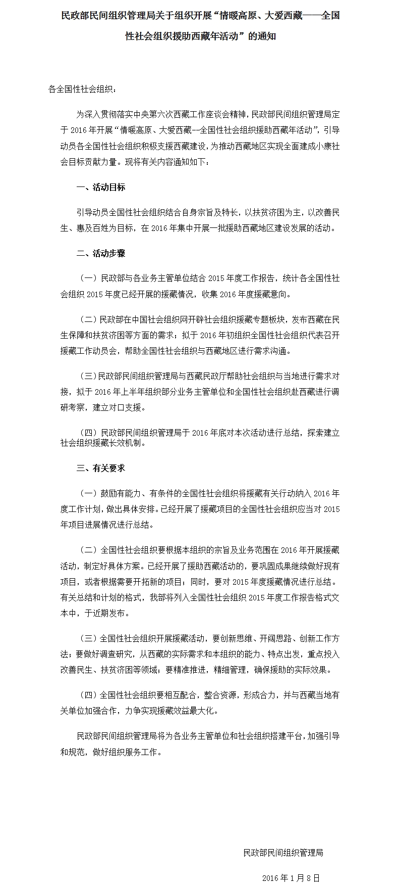 民政部民间组织管理局关于组织开展“情暖高原、大爱西藏——全国性社会组织援助西藏年活动”的通知