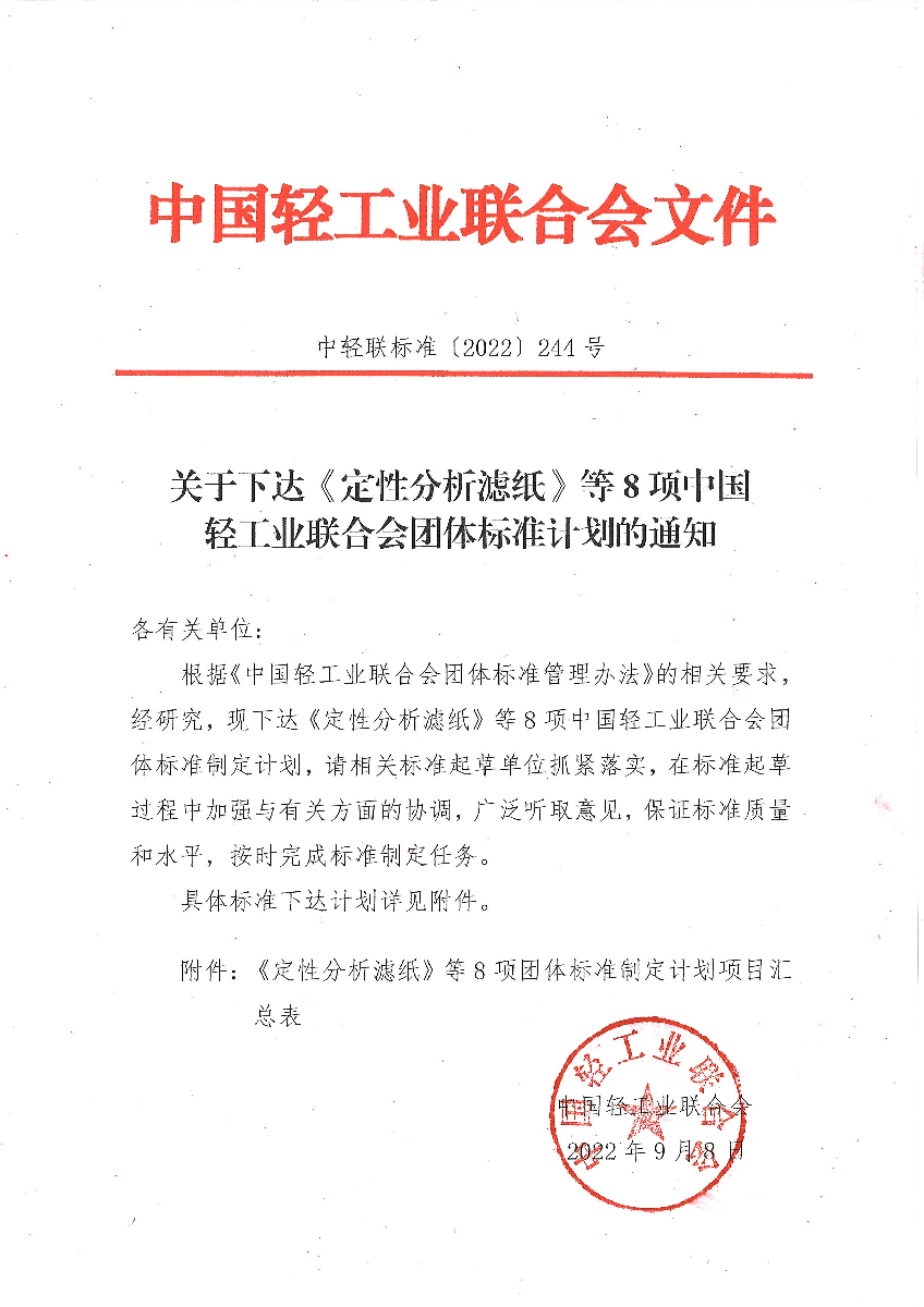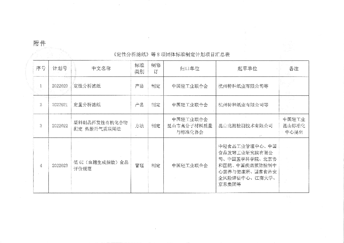 关于下达《定性分析滤纸》等8项优米app下载直播团体标准计划的通知