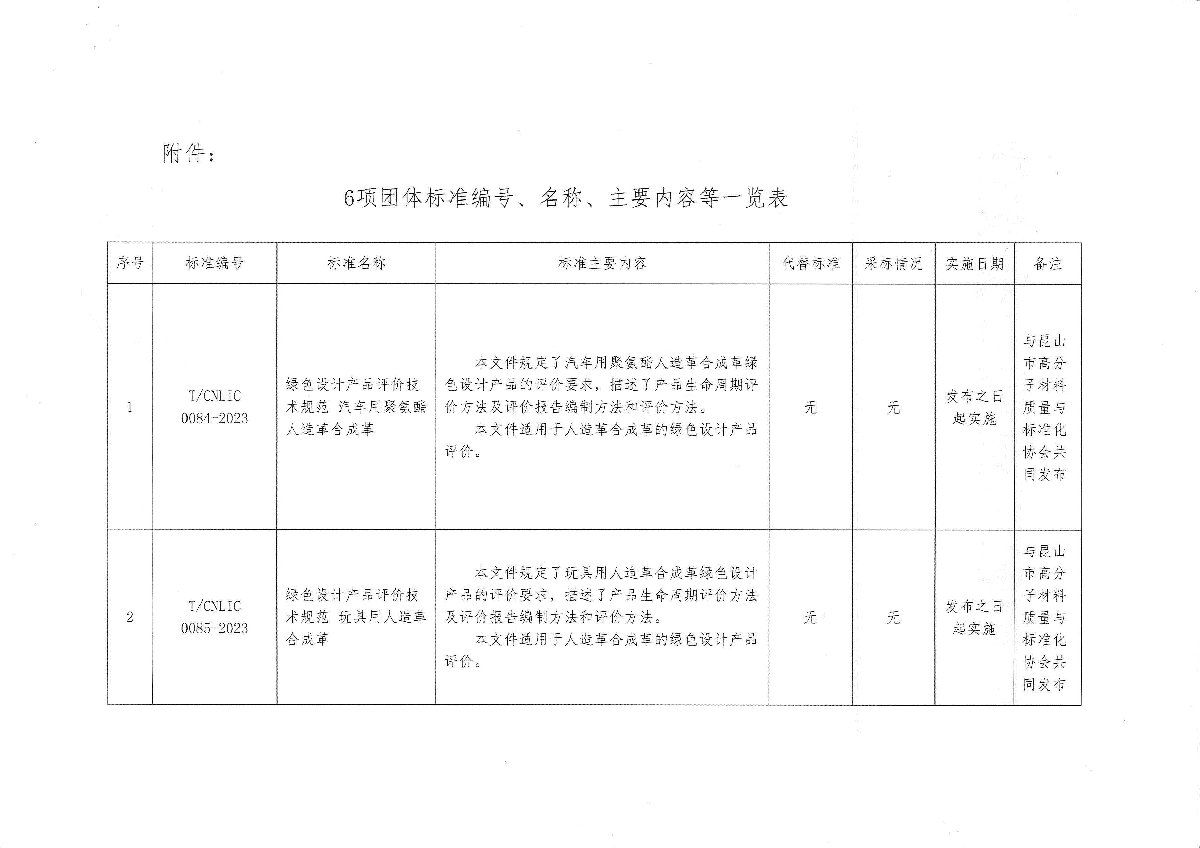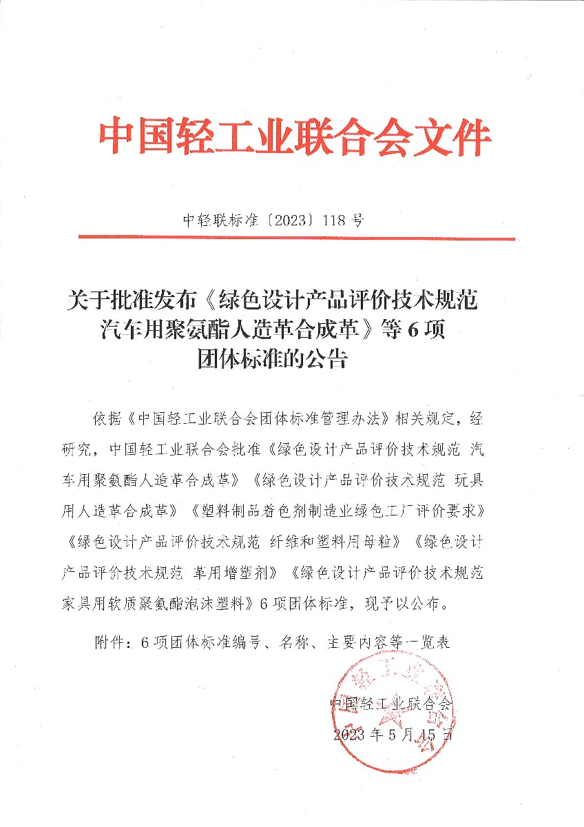 关于批准发布《绿色设计产品评价技术规范 汽车用聚氨酯人造革合成革》等6项团体标准的公告