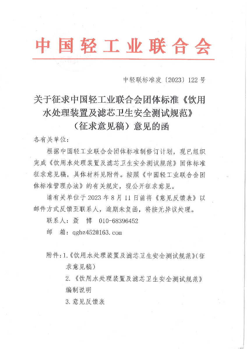 关于征求优米app下载直播团体标准《饮用水处理装置及滤芯卫生安全测试规范》(征求意见稿)意见的函