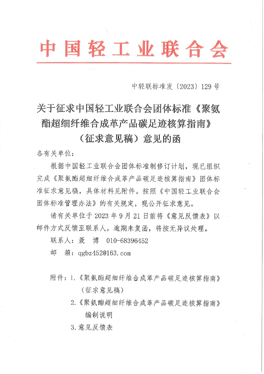 关于征求优米app下载直播团体标准《聚氨酯超细纤维合成革产品碳足迹核算指南》(征求意见稿)意见的函