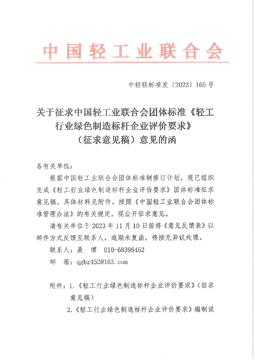 关于征求优米app下载直播团体标准《轻工行业绿色制造标杆企业评价要求》(征求意见稿)意见的函
