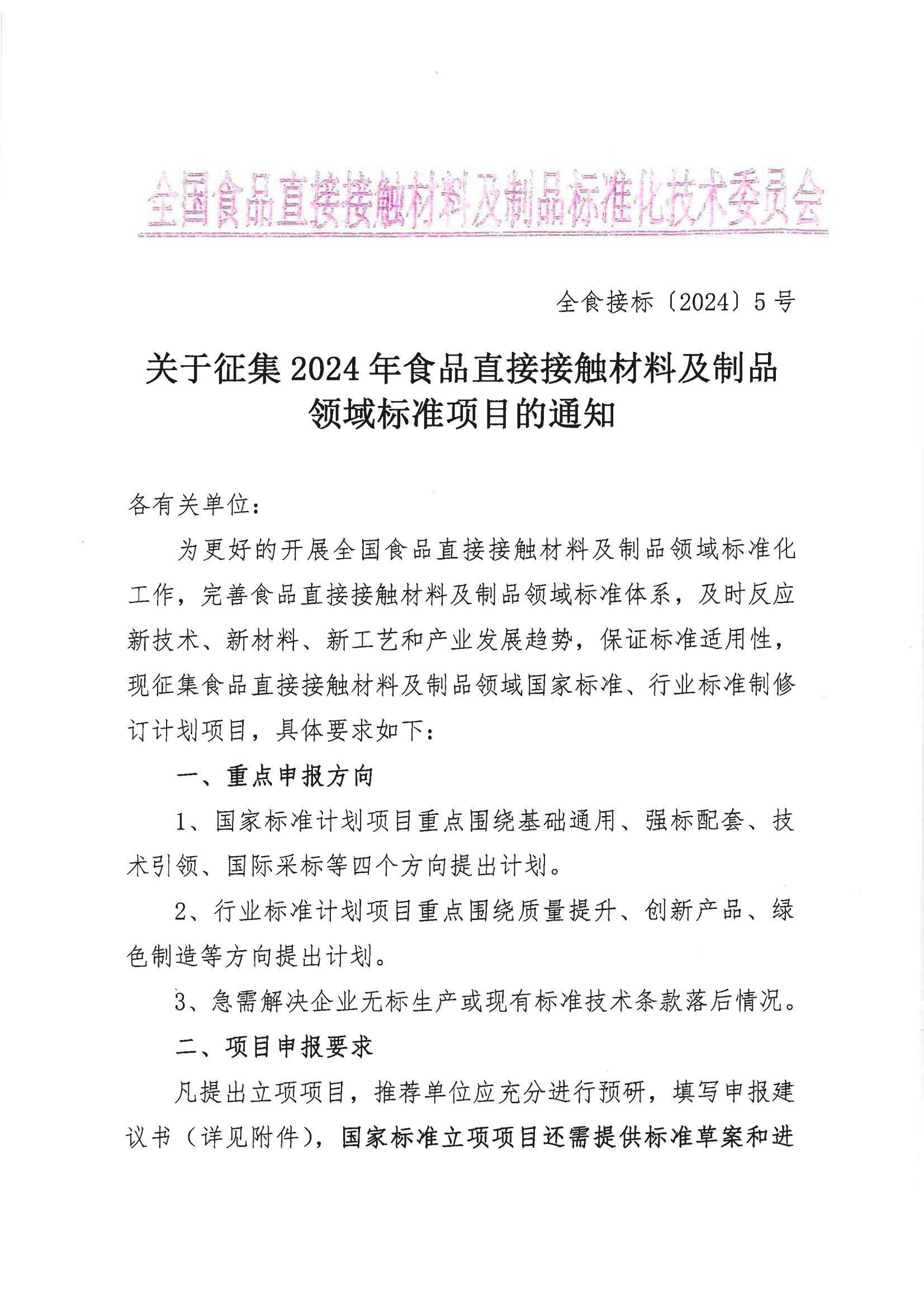 关于征集2024年食品直接接触材料及制品领域标准项目的通知