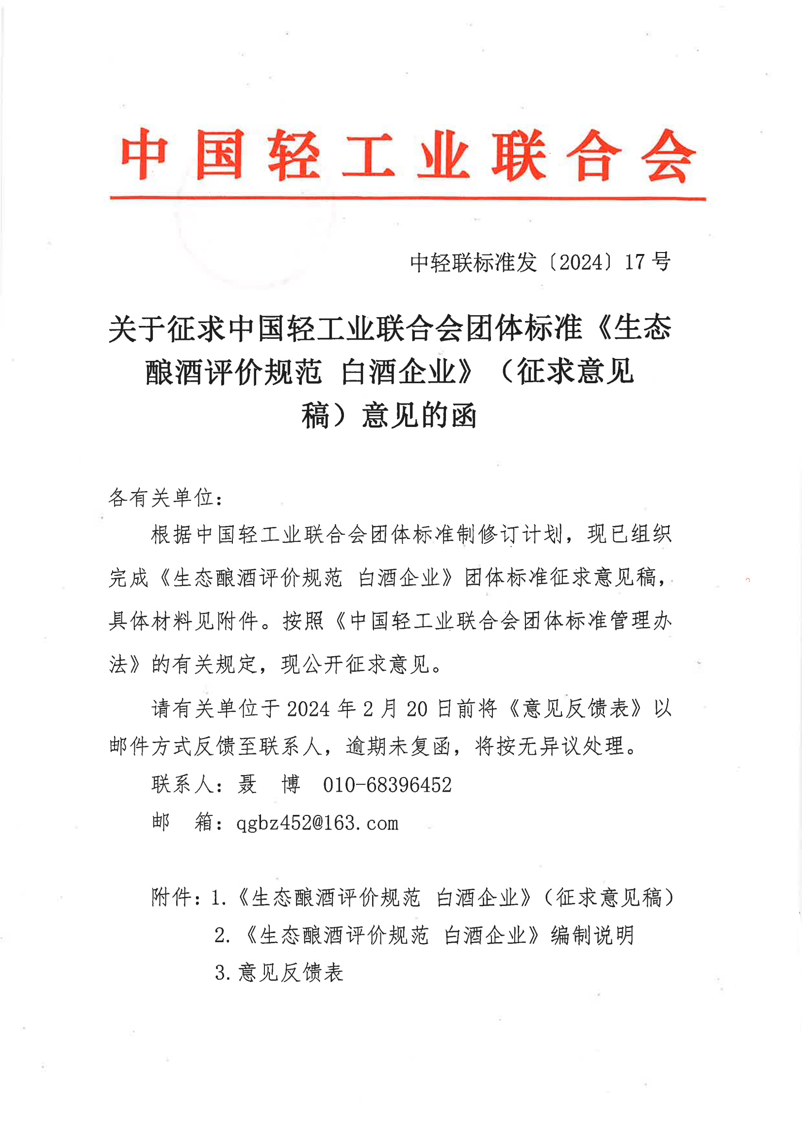 关于征求优米app下载直播团体标准《生态酿酒评价规范 白酒企业》(征求意见稿)意见的函
