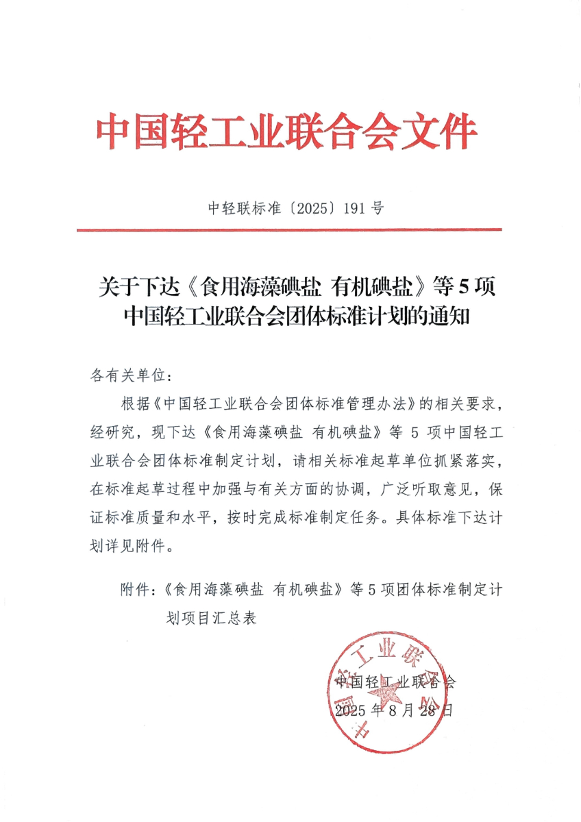 关于下达《食用海藻碘盐 有机碘盐》等5项优米app下载直播团体标准计划的通知
