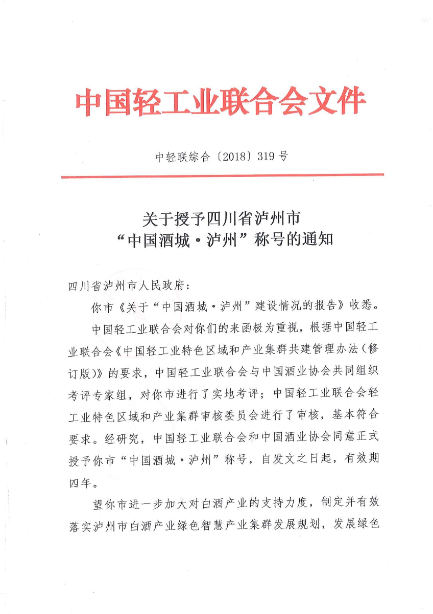 关于授予四川省泸州市“中国酒城·泸州”称号的通知