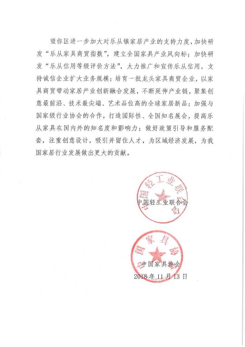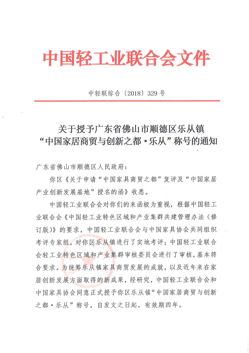 关于授予广东省佛山市顺德区乐从镇“中国家居商贸与创新之都·乐从”称号的通知