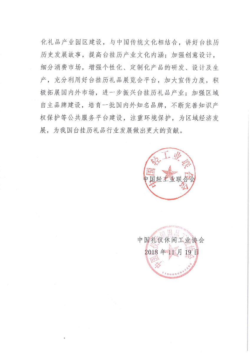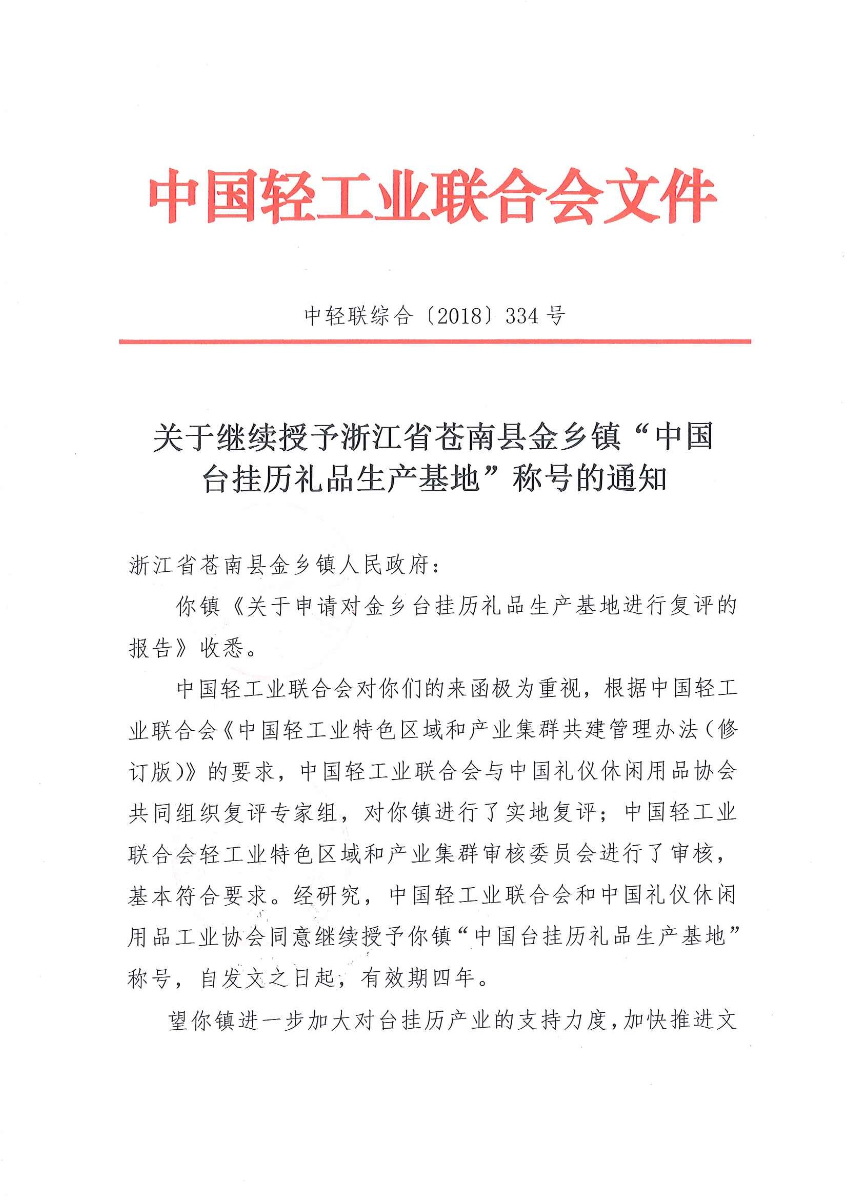 关于继续授予浙江省苍南县金乡镇“中国台挂历礼品生产基地”称号的通知