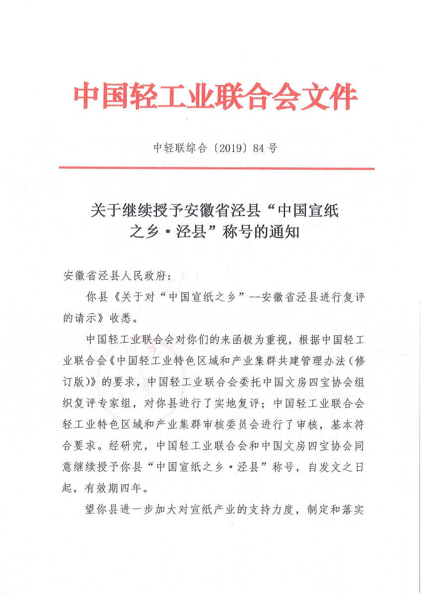 关于继续授予安徽省泾县"中国宣纸之乡·泾县"称号的通知