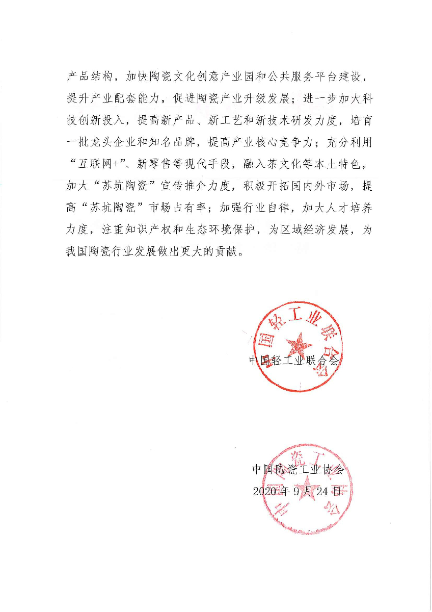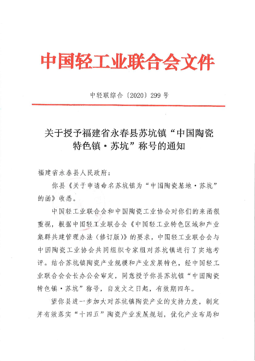 关于授予福建省永春县苏坑镇“中国陶瓷特色镇·苏坑”称号的通知