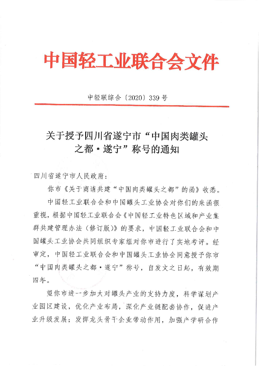 关于授予四川省遂宁市“中国肉类罐头之都·遂宁”称号的通知