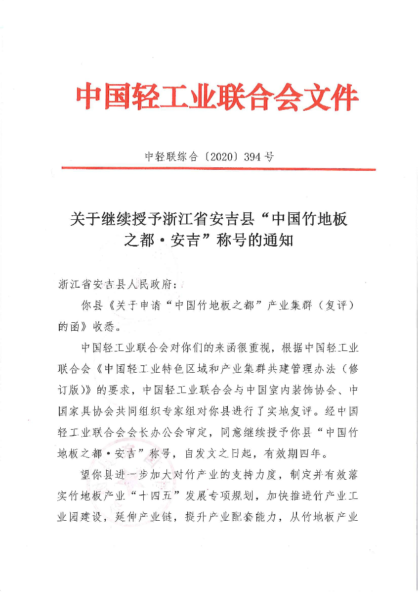 关于继续授予浙江省安吉县“中国竹地板之都·安吉”称号的通知