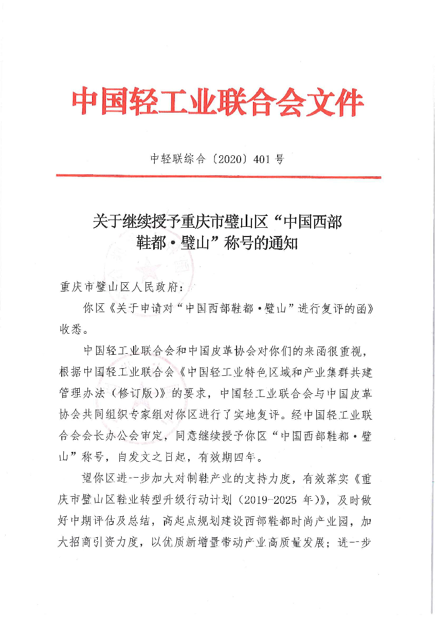 关于继续授予重庆市璧山区“中国西部鞋都·璧山”称号的通知