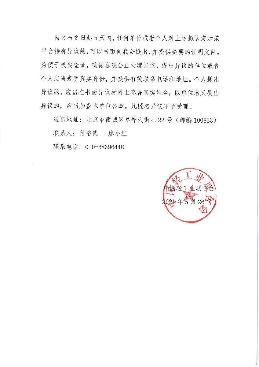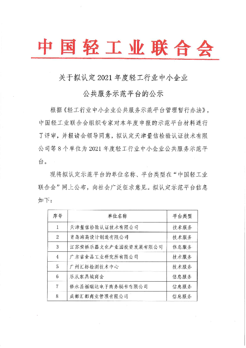 关于拟认定2021年度轻工行业中小企业公共服务示范平台的公示