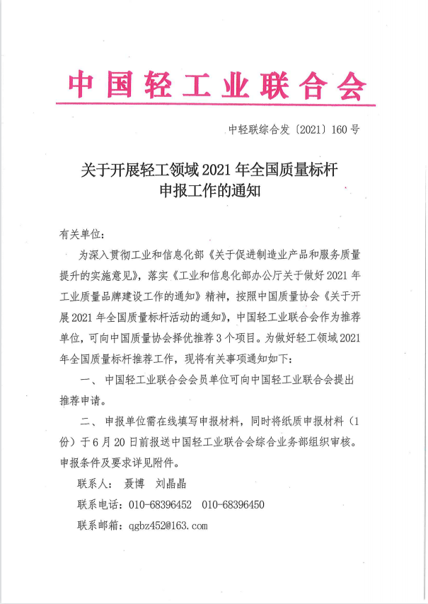 关于开展轻工领域2021年全国质量标杆申报工作的通知