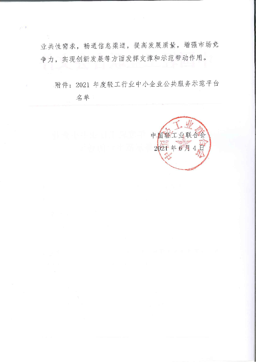 关于认定2021年度轻工行业中小企业公共服务示范平台的通知