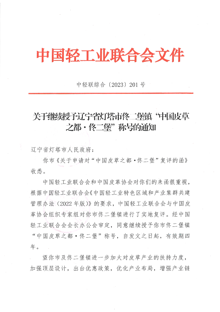 关于继续授予辽宁省灯塔市佟二堡镇“中国皮草之都·佟二堡”称号的通知