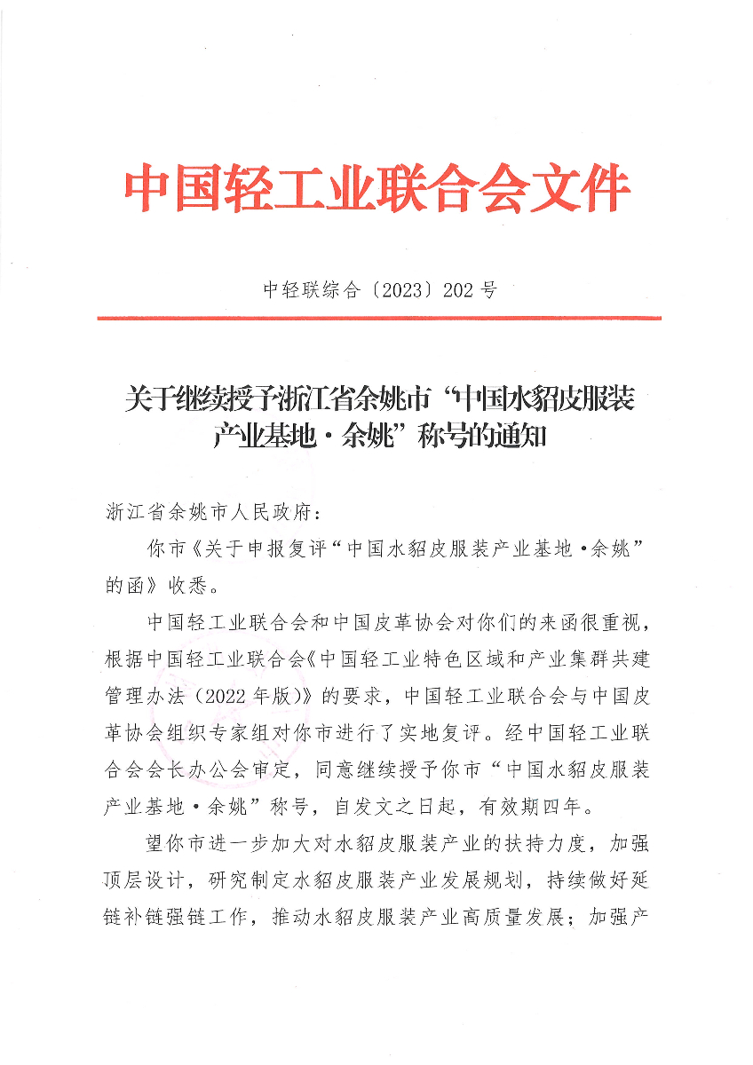 关于继续授予浙江省余姚市“中国水貂皮服装产业基地·余姚”称号的通知