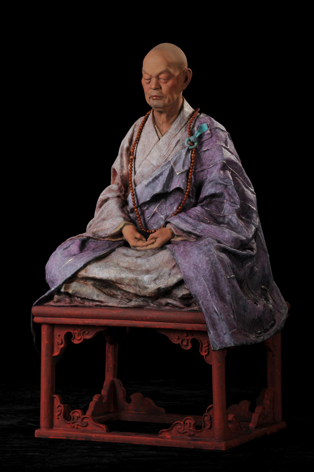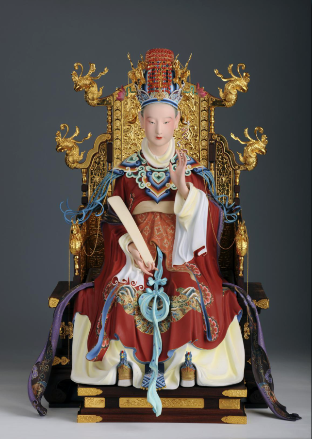 银质彩绘 高56厘米 妈祖文化是中华民族文化宝库中重要的瑰宝,肇于宋,成于元,兴于明,盛于清,繁荣于近现代。此座妈祖造像端庄典雅,面庞圆润,端坐鸾椅之上,头戴九旒冕冠,身着朱衣,云肩霞被。右手持如意,左手手指竖举于胸前,指间有一缕袅袅云烟,象征着指引客商渔船的安全返航。