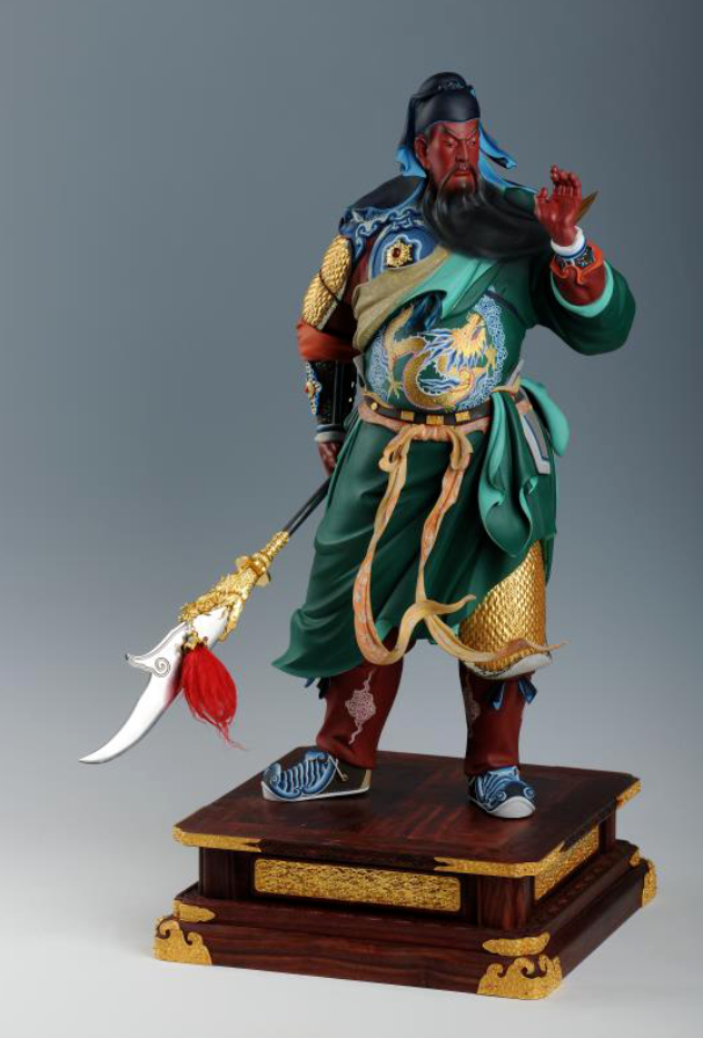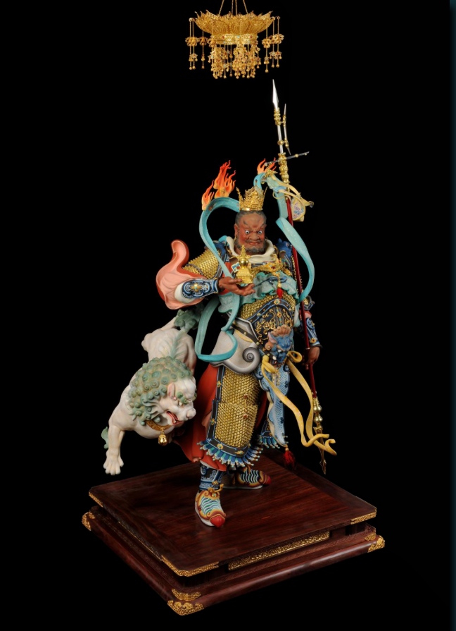 作品继承了唐宋以来传统彩塑技艺与艺术风格。此组造像中天王头戴天冠,面色端严,身着金色铠甲,内衬天衣,左手执戟,右擎宝塔,身后奔腾一咆哮绿鬃白狮,从天而降,威震八方,一派天将风范。