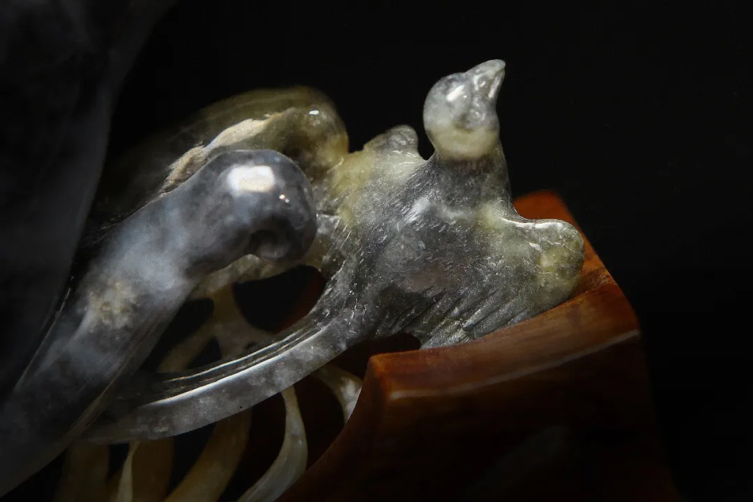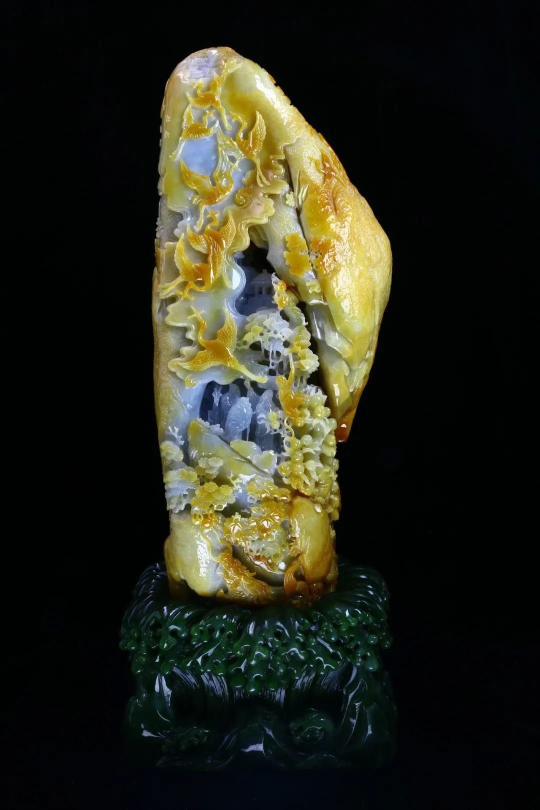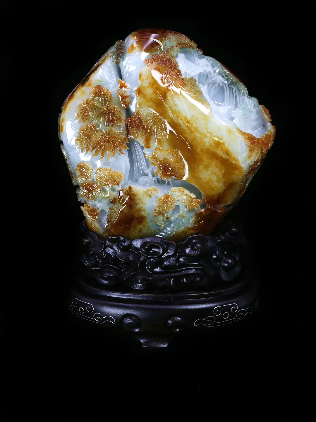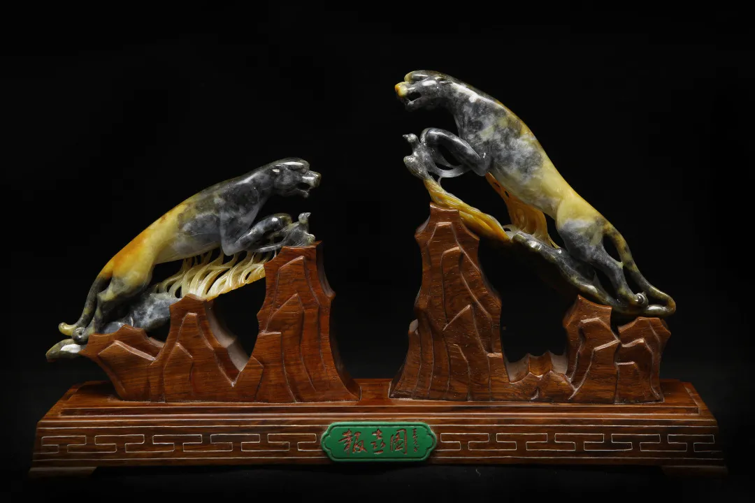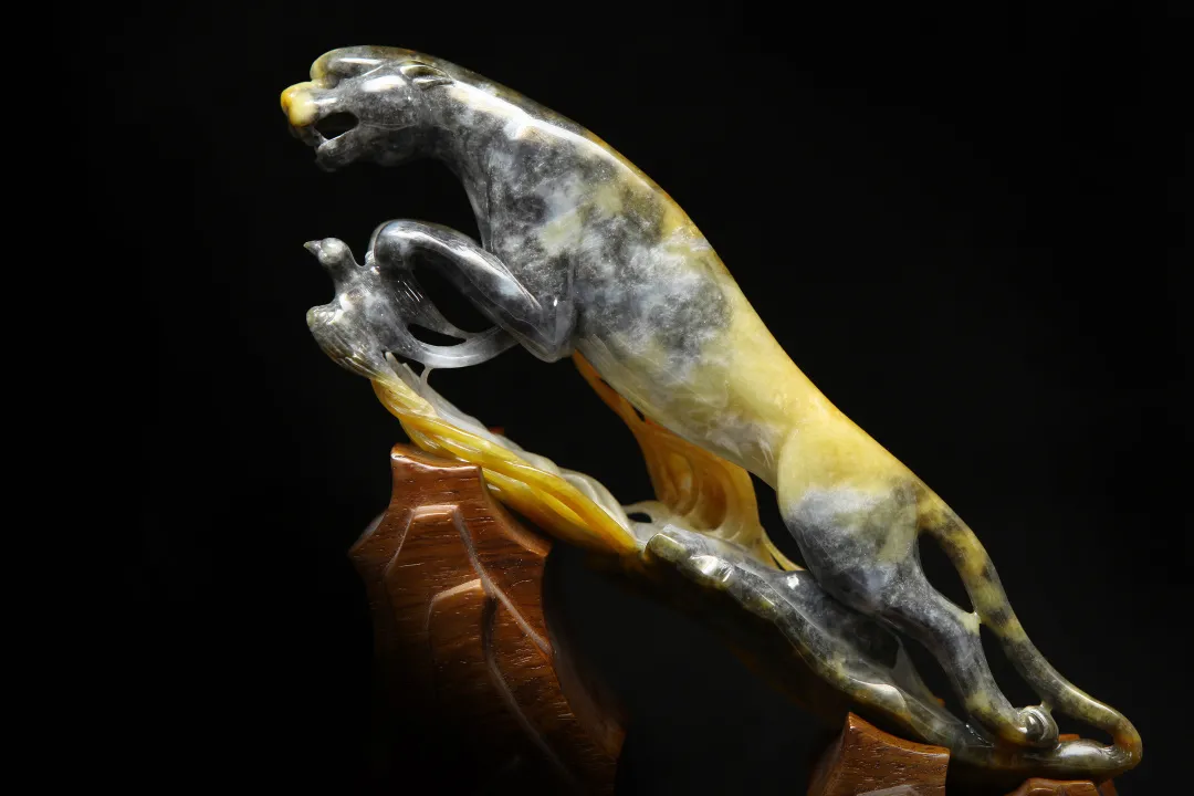作品灵感来源于青铜器《马踏飞燕》,原石为黄黑相间的怪桩料。豹子与喜鹊谐音“报喜”,飞奔的豹子脚踏喜鹊,传递佳作送喜的美好寓意。