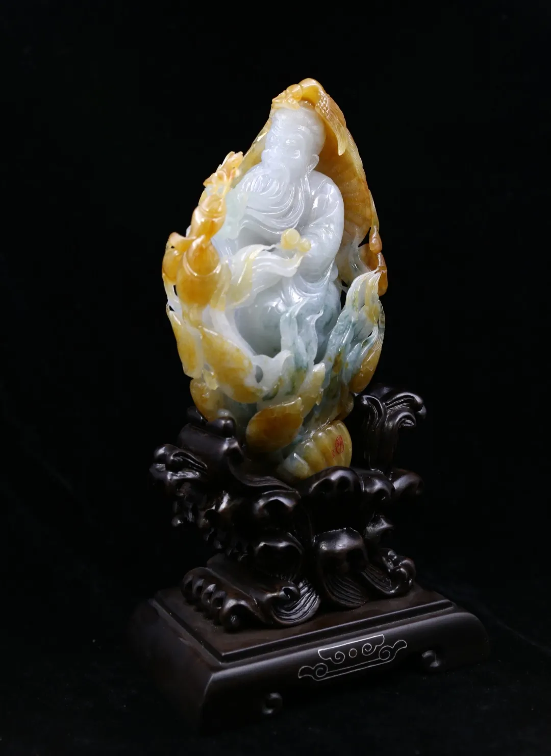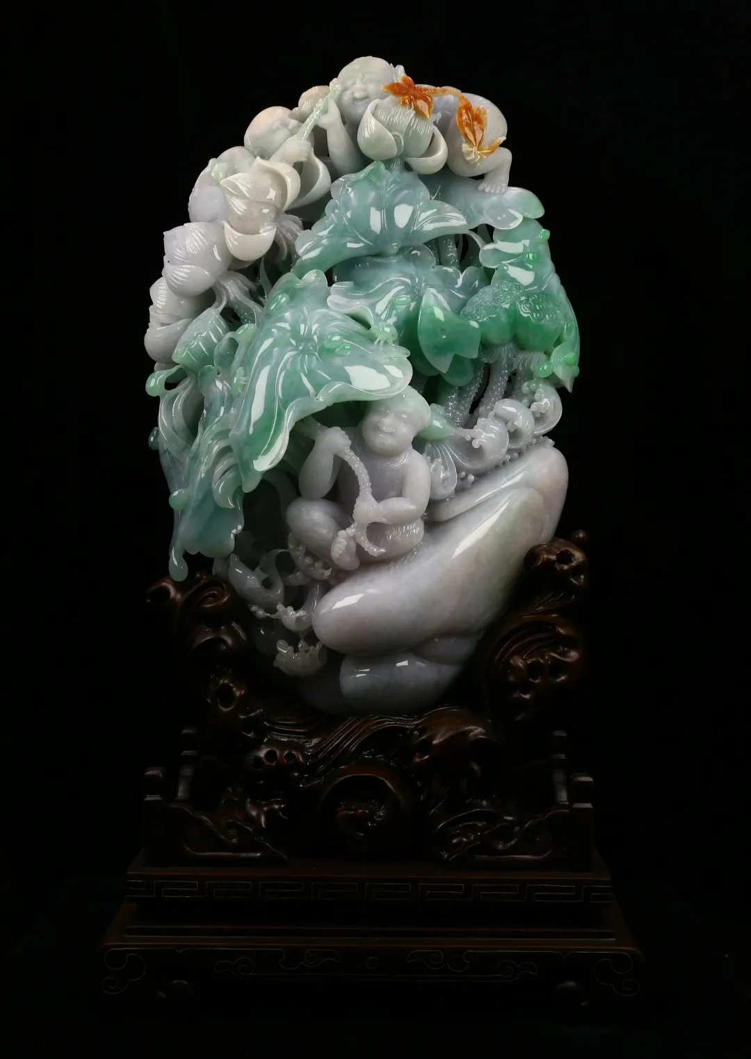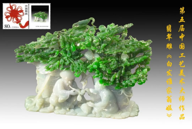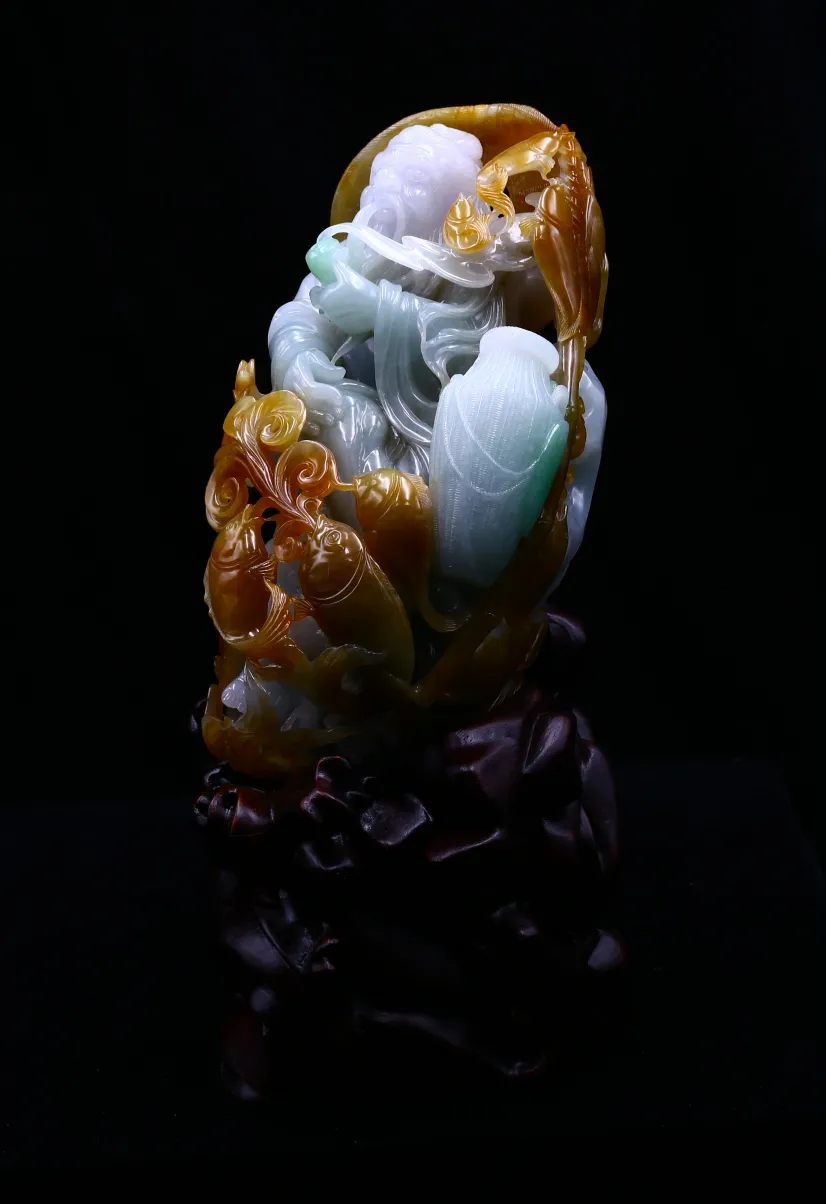 作品采用翡翠水石料,利用圆雕、镂空雕技艺,俏色巧雕,丰富了画面的层次,充满动感。渔翁身背斗笠,手持烟斗,盘腿而坐,鱼鹰俯卧其上,鱼跃出水,呈现出悠然的水边美景。