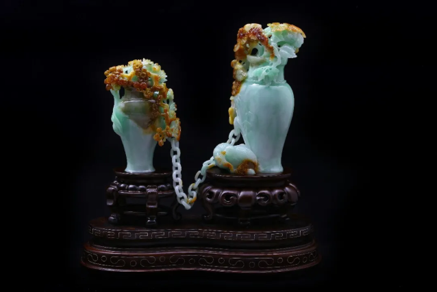 作品选用翡翠整料,颜色丰富,种水细腻。玉链环环相扣,玉瓶串联其上,瓶中雕刻四季花卉梅兰竹菊,寓意四季保平(宝瓶)安;瓶旁雕刻一对鹌鹑,寓意安居乐业;黄色俏色巧雕成蝙蝠,寓意福气临门。