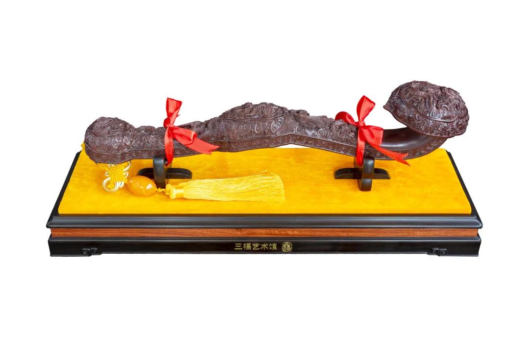作品精选名贵木材印度小叶紫檀老料为材,工艺精湛,传神生动。如意首呈心形灵芝状,体形弧曲圆浑,满雕纹饰,神龙张口旋身,曲颈昂首腾跃于空,回首望凤,翔凤展翅翘尾,举目眺龙,周围瑞云朵朵,一派祥和之气。寓意富贵吉祥、福气安康、财运连绵、节节高升。