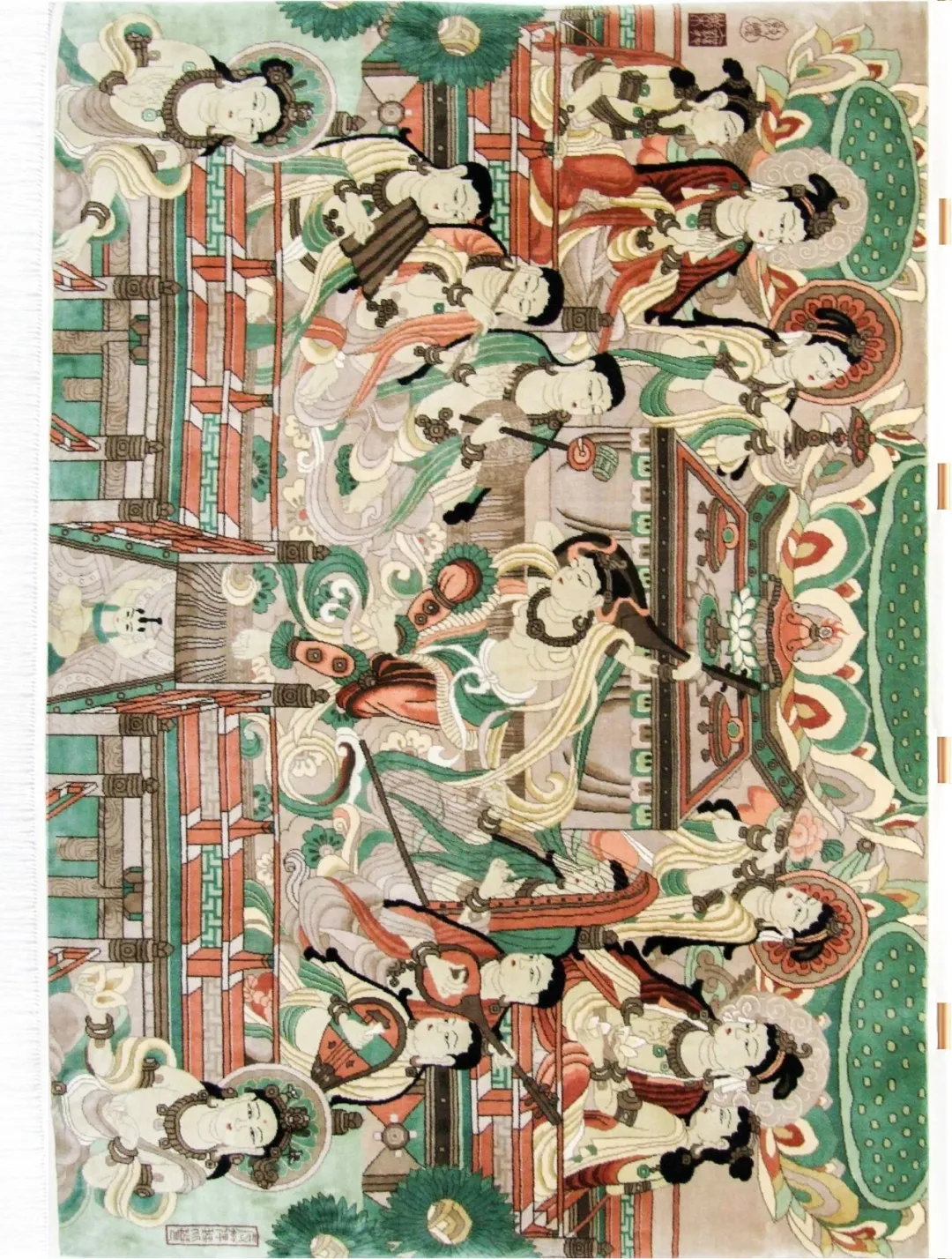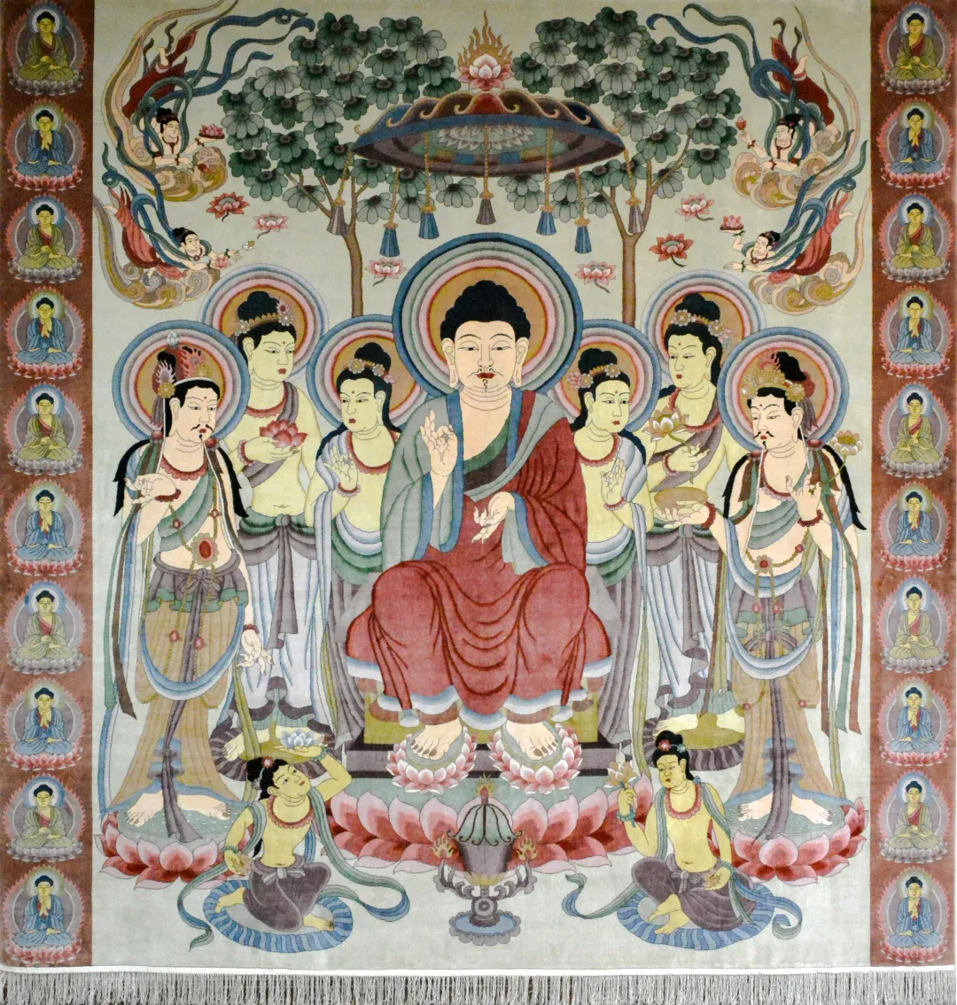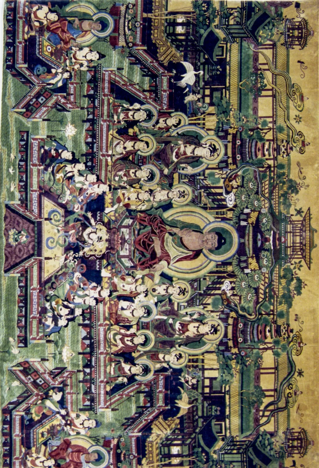 作品根据敦煌榆林窟25窟南壁观无寿经变壁画再设计制作而成。采用200道手工编织“8”字形抽绞栽绒工艺方法,60支天然绢丝为原料精制而成。该挂毯画面布局严谨,内容饱满,色彩丰富,场面宏大,生动传神地描绘了西方极乐世界的佛国景象。