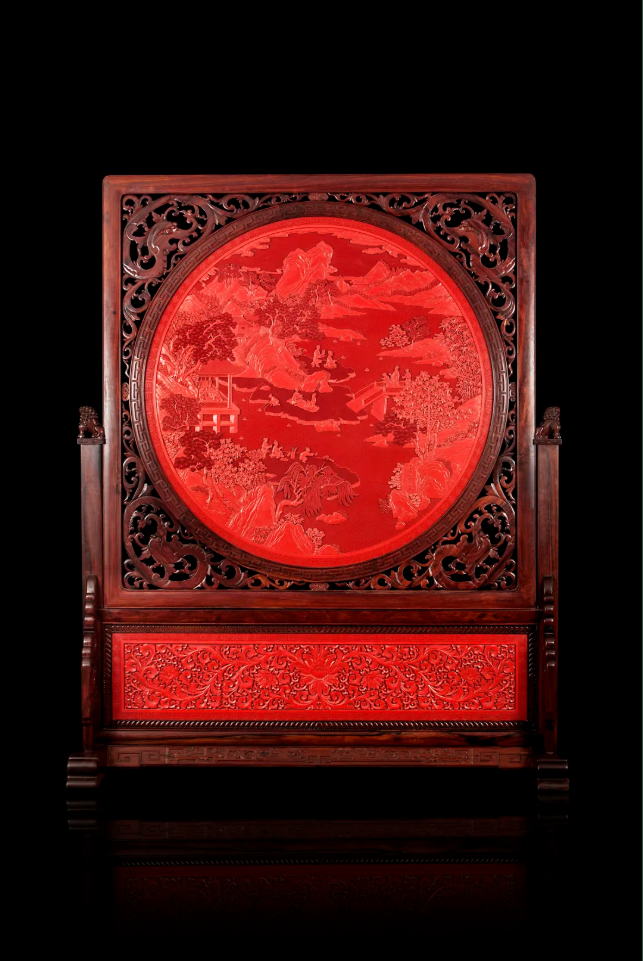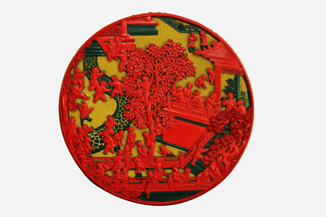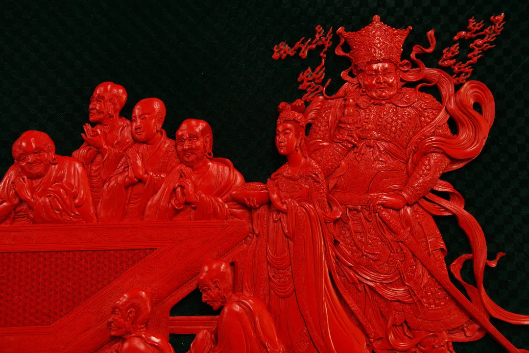 此作品为铜胎,胎上层层髹饰朱红色大漆,经数十道工序雕刻而成。作品刻画的是郭子仪拜寿的故事场景,人物众多、场面宏大,寓意吉祥。作品运用了高浮雕、深浮雕等多种现代高精尖的雕漆技法,层次分明、做工考究。作品人物形象多样,动静相宜,山石树木穿插其中,建筑雕刻立体感强,画面丰富自然、充实而又饱满。