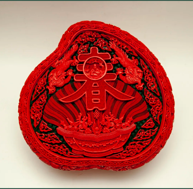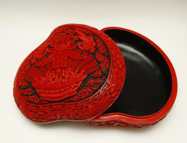 作品为铜胎,其上先后髹饰绿色和红色大漆制作而成。作品在传统圆形春字捧盒的基础上进行了大胆改良,用桃形器型凸显庆寿的主题,独具匠心。盒身通体雕刻寿桃纹,与器型交相辉映。寿桃上雕刻三尖、四方花、老虎爪、古禄钱等五十多种锦文,结构复杂严谨,雕工精巧细致,设计师古不泥。