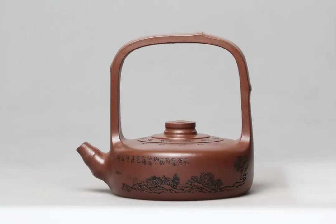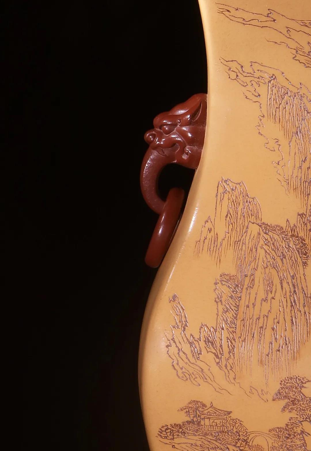 竹,有着不一般的中国传统文化含义,四季常青寓顽强生命,内心中空寓虚怀若谷,弯而不折寓柔中有刚,生而有节、竹节必露寓高风亮节。壶型和壶名丝丝入扣,壶型融入竹之精神,浑然一体。壶身正面刻绘山水,壶盖装饰以钟鼎文,集中国书法绘画之大成,刻绘铁划银钩,凝练古朴,神韵怡然,与“竹露生香”造型相映生辉。