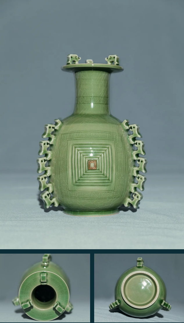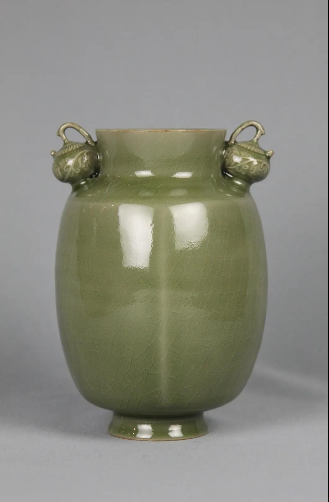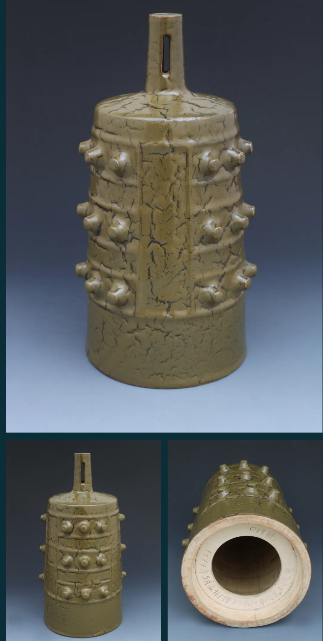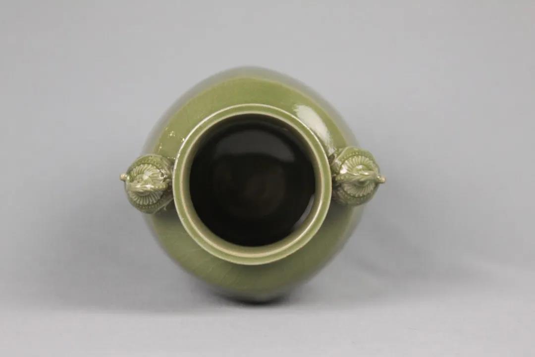 作品造型学习西部虢国玉琮,拉、修圆坯后拍打成外方中圆,大口以内的泥「指花」有条不紊旋升的方圆变化,与外部方正洁素同叙着佛学清净纯朴的久远博大。口沿上一粗一细的文武弦纹旁,玲珑精巧的「倒装壶」双耳道明醍醐灌顶主题;而晃摇罐身时从倒装壶耳中传出来的声动,似佛陀讲法之妙音,像僧众诵经之齐唱。硬朗晶莹的青釉又如紫竹林的清风徐来,顺着罐势自然冰裂的长纹,若同明月松间洗心的万涓细流。