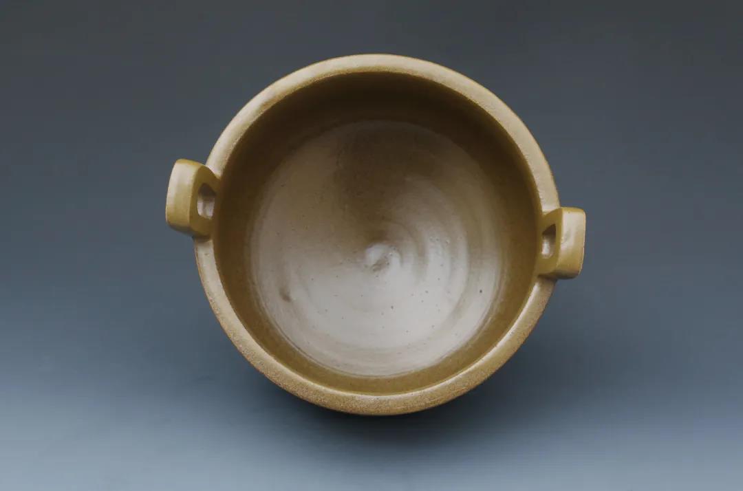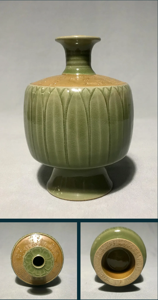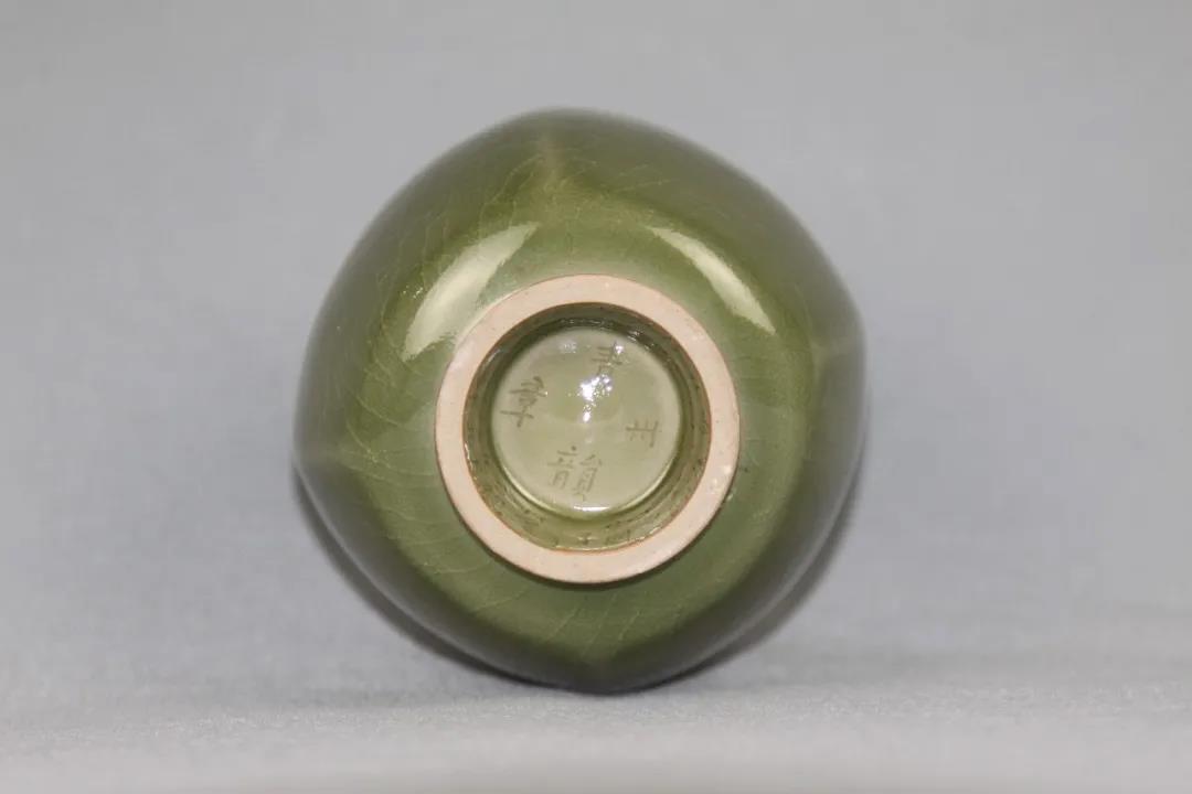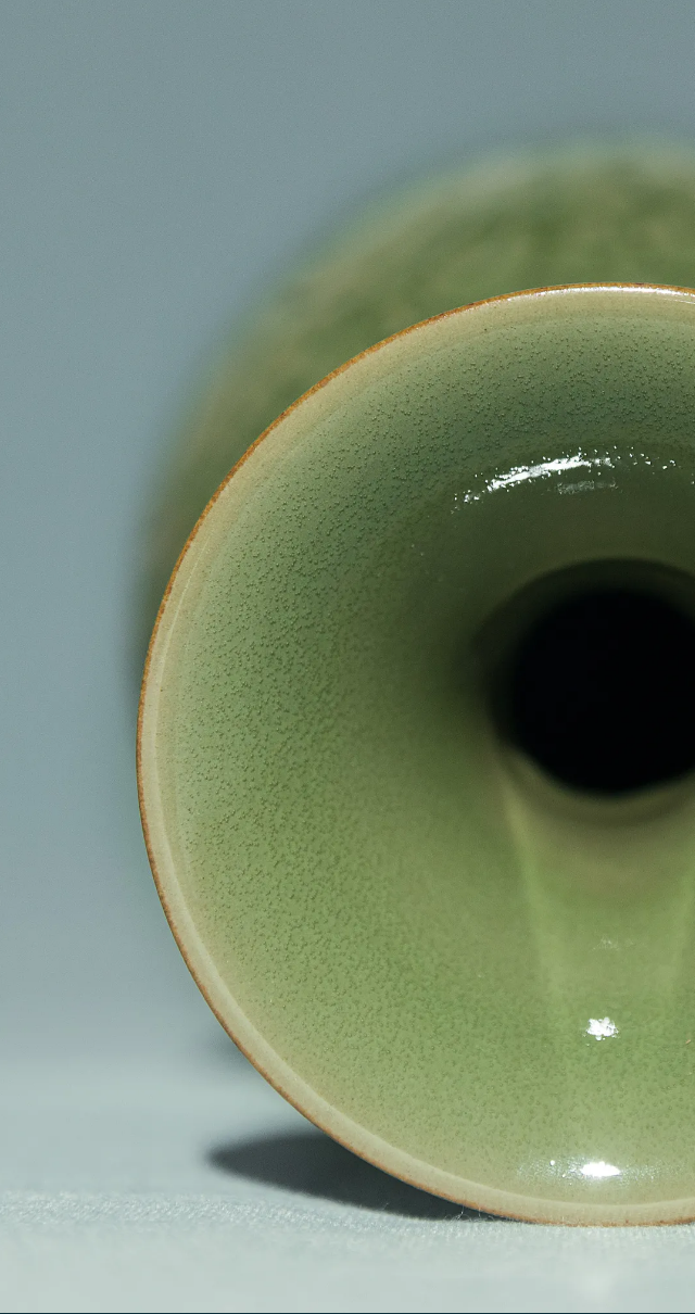 作品造型学习西部虢国玉琮,拉、修圆坯后拍打成外方中圆,大口以内的泥「指花」有条不紊旋升的方圆变化,与外部方正洁素同叙着佛学清净纯朴的久远博大。口沿上一粗一细的文武弦纹旁,玲珑精巧的「倒装壶」双耳道明醍醐灌顶主题;而晃摇罐身时从倒装壶耳中传出来的声动,似佛陀讲法之妙音,像僧众诵经之齐唱。硬朗晶莹的青釉又如紫竹林的清风徐来,顺着罐势自然冰裂的长纹,若同明月松间洗心的万涓细流。