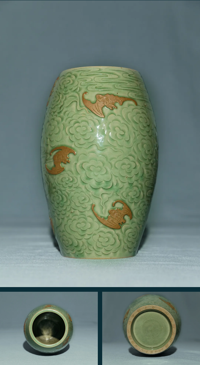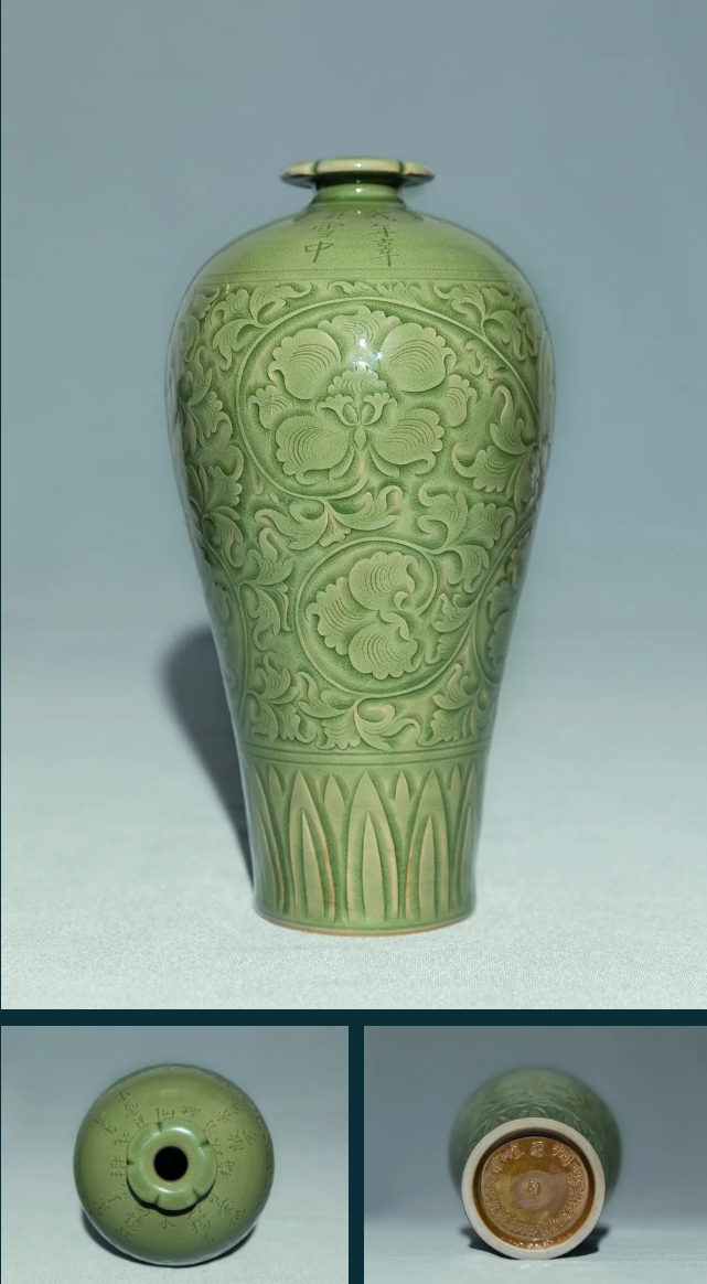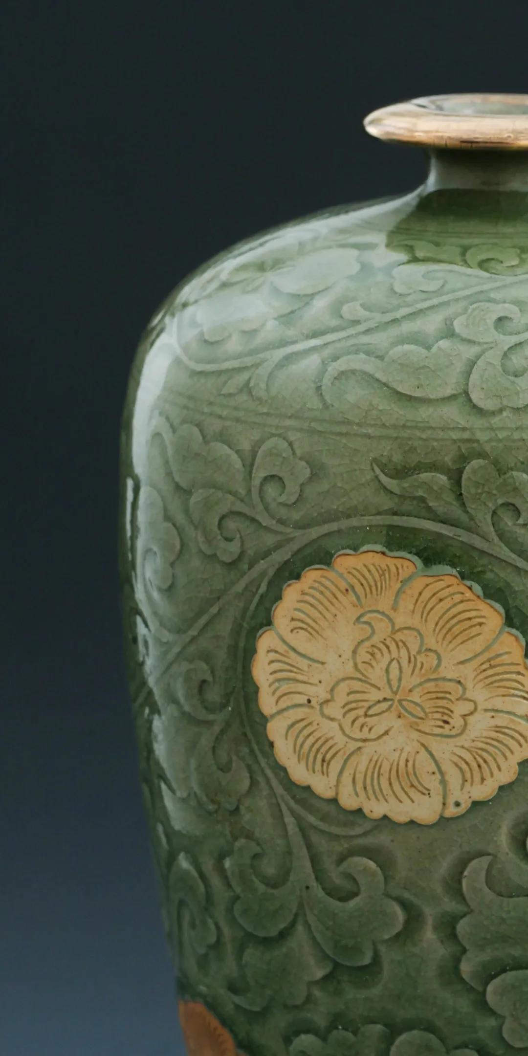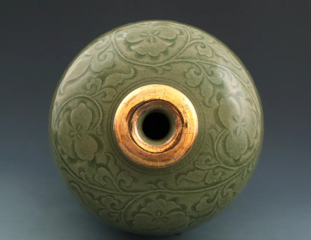 作品造型峭拔伟岸,俊秀端庄。所刻缠枝牡丹刀锋犀利,线条流畅,纹样活泼,双刀刻的功力尤显深厚。青釉满施,晶莹玉润,冰纹密布,与刻花相映生辉。高温成瓷后,瓶嘴描金,再入窑三次烤金,越显高贵富丽,使整体艺术效果愈加典雅而不同凡响,是在宋代耀州窑最经典的梅瓶基础上吸取其精华,又结合现代审美意识而制成的青瓷精品。