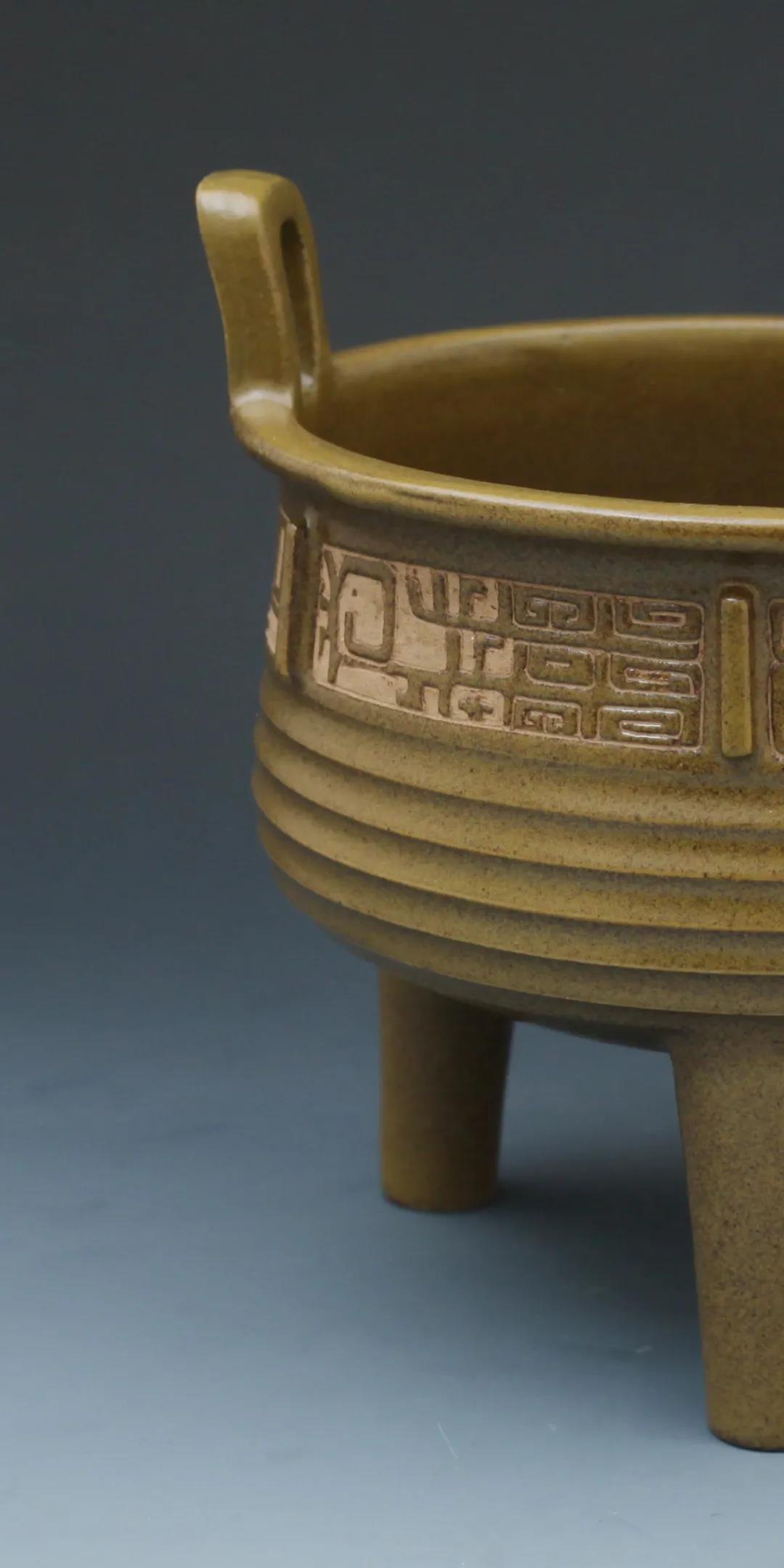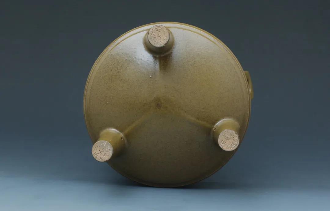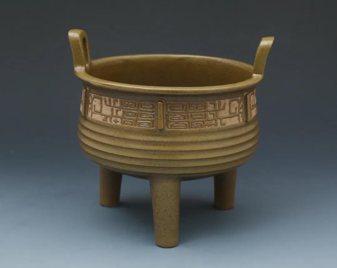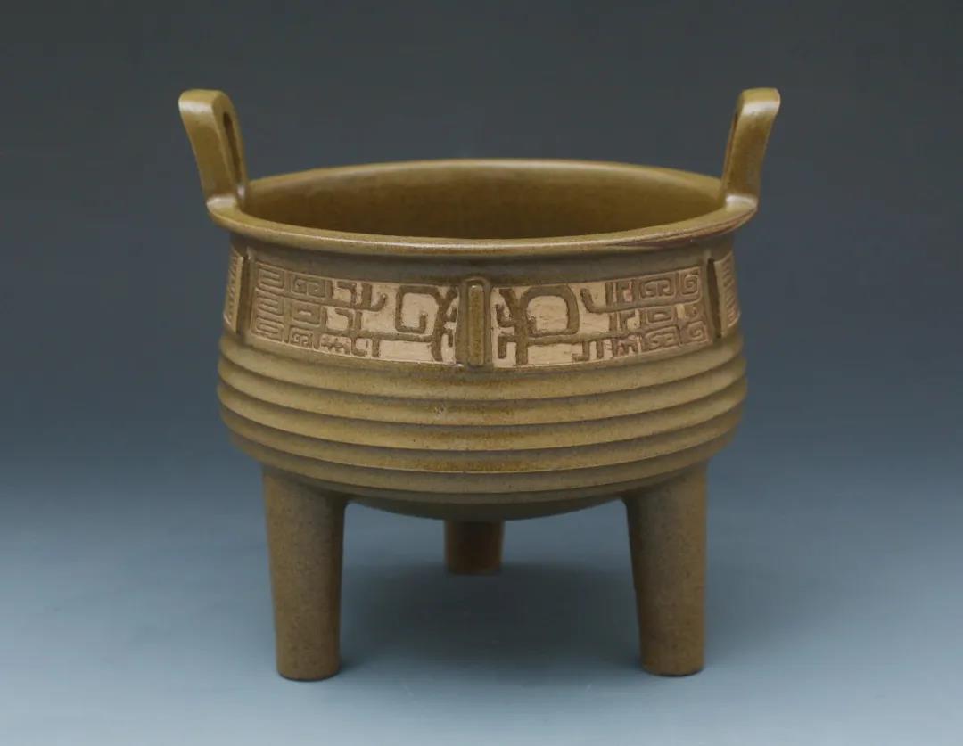 作品造型学习西周青铜器,敦厚大方,洗练简约,沿上一对直耳与器身浑然一体,三足托起更有灵气,腹部剔划龙纹,利落乾净。鼎内篆划[中华鼎盛]明示主题,三个圆柱足底皆有作者刻款鈐印。茶叶沫釉色彩与青铜器同调,稳健典雅又生机盎然。