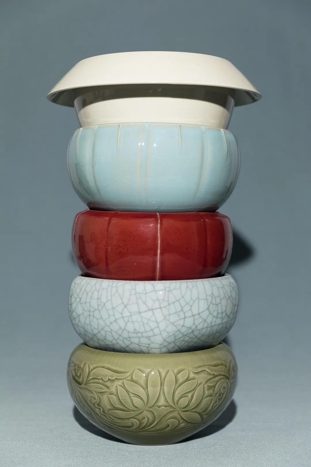 2015年,孟树锋大师因复原试烧仿唐柴窑灼伤眼睛,经四次手术治疗退休后,变2005年《佛经缽》旧作,携联定、汝、钧、官、耀五窑,五瓷,成五套缽,以合现《心经》之“五蕴皆空”并合成五个“五”。同时也为展示诸窑包容团结,互助互学,共同进步之风采,特远迈冀、豫,冒酷暑寒秋制瓷作念。