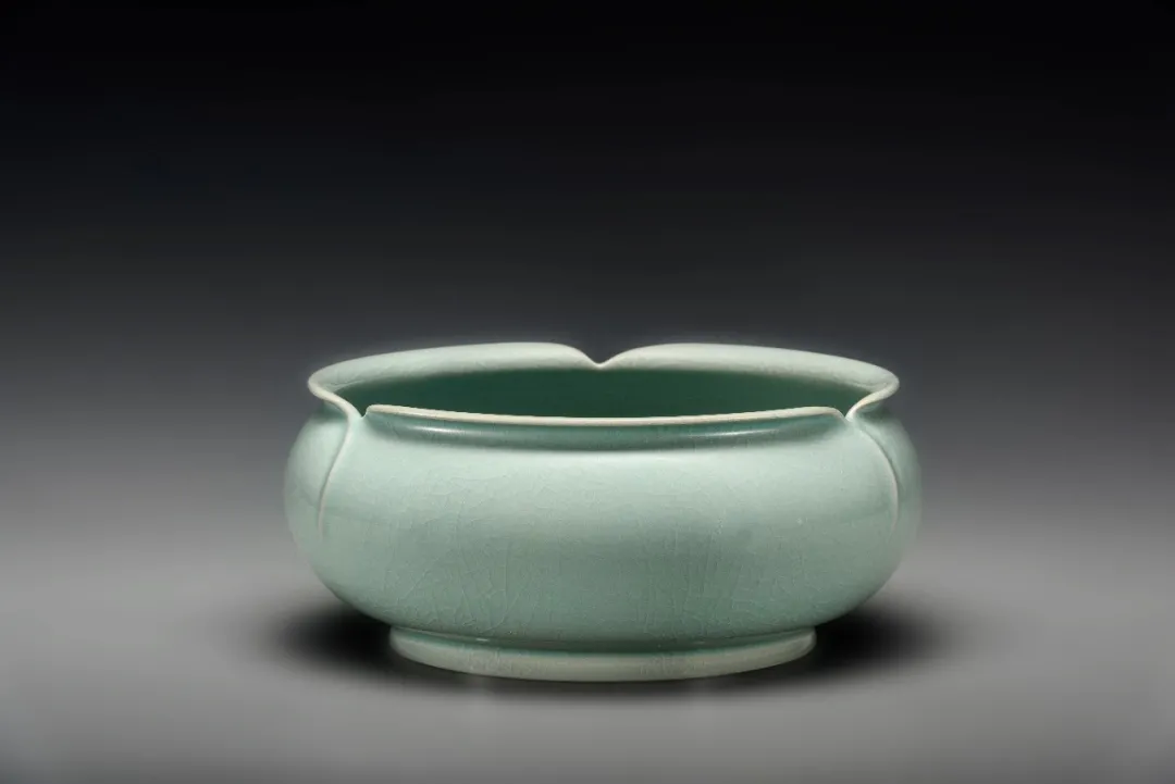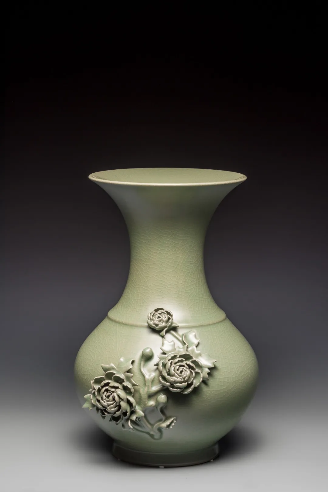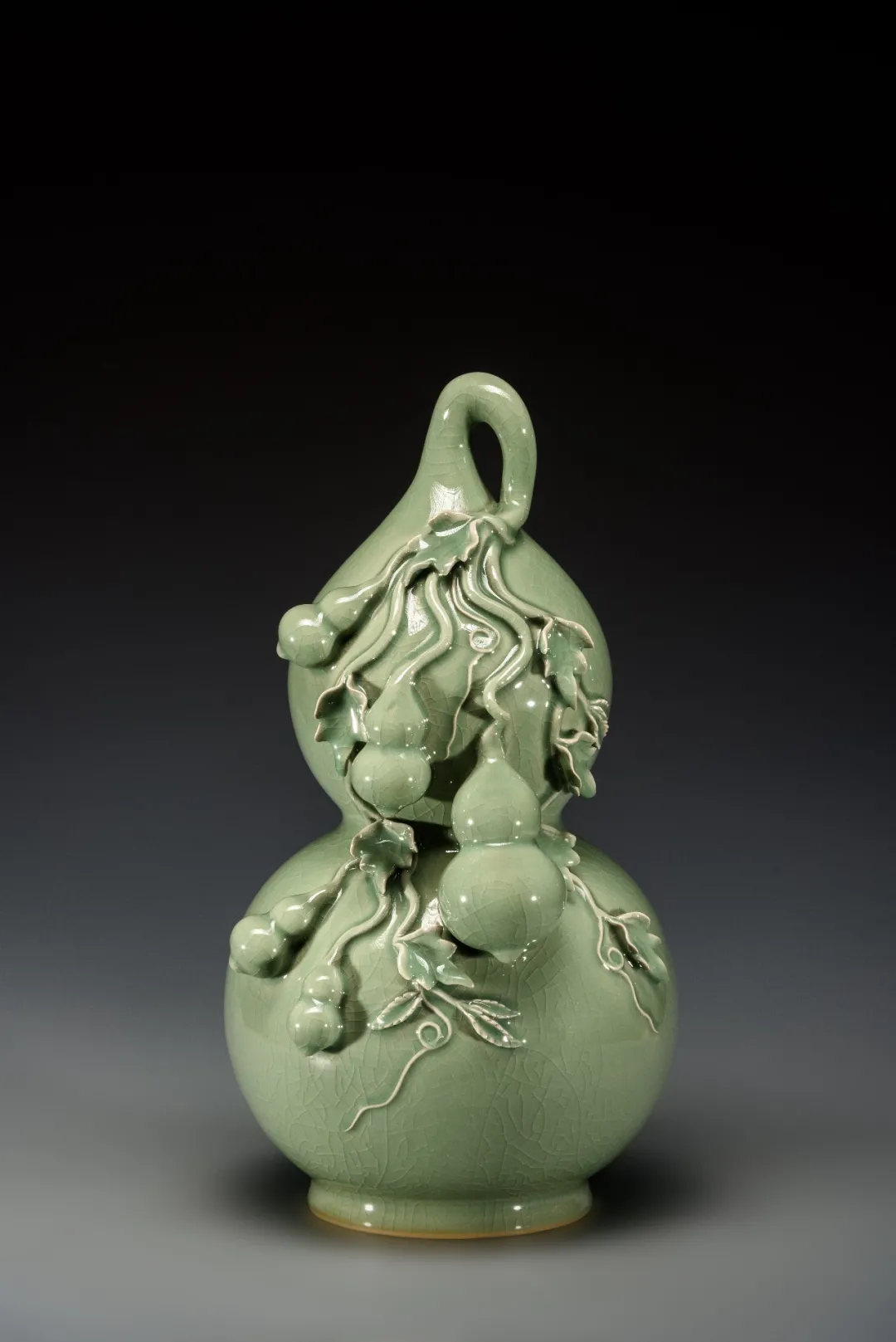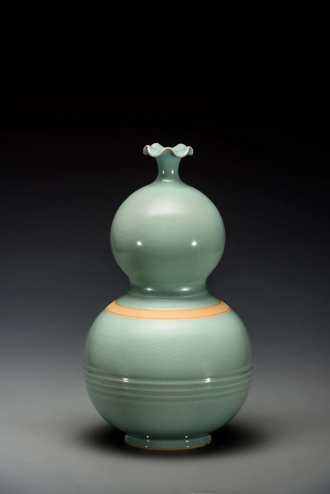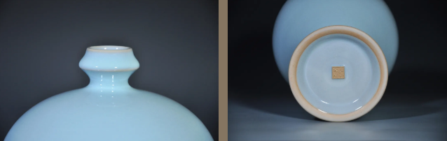 孟大师作品继承了北宋汝瓷艺术风格,将天青、天蓝、豆绿、月白等釉色的绝美风姿展现得淋漓尽致,同时又融入了元明造器风格,创作的汝瓷作品器型稳健大气、古朴秀美,色泽青翠华滋、澄澈清透,釉汁肥润莹亮、有如堆脂,视如碧玉,扣声如馨,质感甚佳。孟大师作品除仿古风格之外,还巧妙地将汝瓷与现代人文环境、社会生活相融合,创作出富含现代元素的创新之作。《富贵》《国色天香》等作品别出心裁,利用捏塑、堆雕等技法,将立体花卉植物融进传统汝瓷创作,使作品更具生机;作品《童趣》突破传统汝瓷器型,采用肤色泥新技术,塑造了更加逼真的孩童形象,使传统汝瓷绽放出新的光彩。
