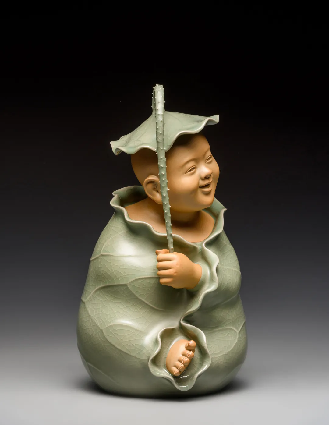 作品以中国农村小孩游戏为题材,反映改革开放四十年来,我国农村人民安居乐业,生活富足,社会和谐,欣欣向荣的景象。作品采用肤色泥新技术制作而成,利用捏塑、雕塑等手法,面部、手和足不再施釉,将人物的动作表情、内心世界更清晰生动的表现出来,造型优美,釉色纯净温润。