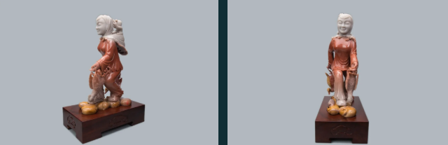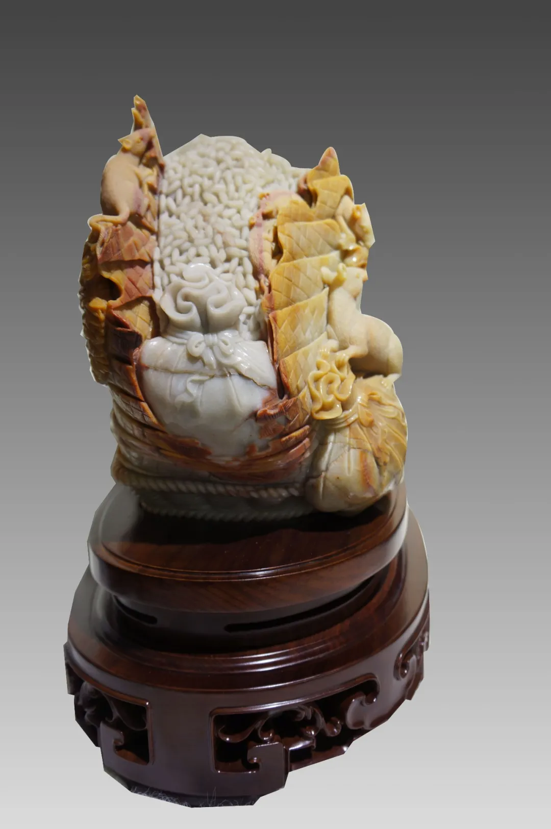 作品巧妙利用红、黄、白三色俏色密玉,将红色部分雕刻为衣着服饰,将黄色部分雕刻为鸡和鸭,色彩运用合理恰当,富有浓厚的乡土气息。作品创作灵感来源于经典民谣《回娘家》,“身穿大红袄,头戴一枝花,胭脂和香粉她的脸上擦,左手一只鸡,右手一只鸭,身上还背着一个胖娃娃”,充分刻画出广大劳动人民对美好生活的淳朴向往和乐观向上的生活态度。