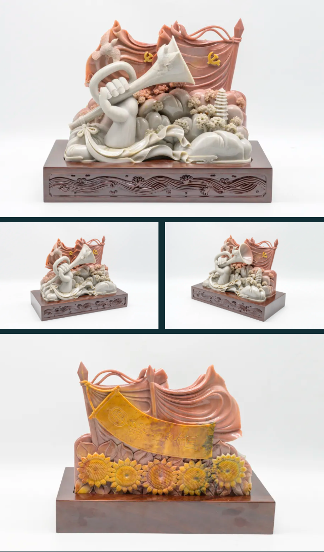 作品料取红、黄、白三色俏色密玉,布局紧凑,排列有序,层次分明。用红色表现猎猎红旗,黄色表现熠熠党徽,构思巧妙,相得益彰。用夸张的手法表现军号,和平鸽环绕其上,其后群山环绕,延安塔耸立其间,突出以和平为目的的军事主题。