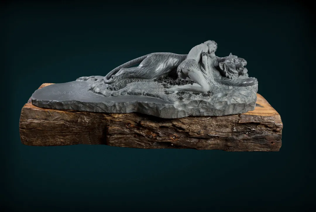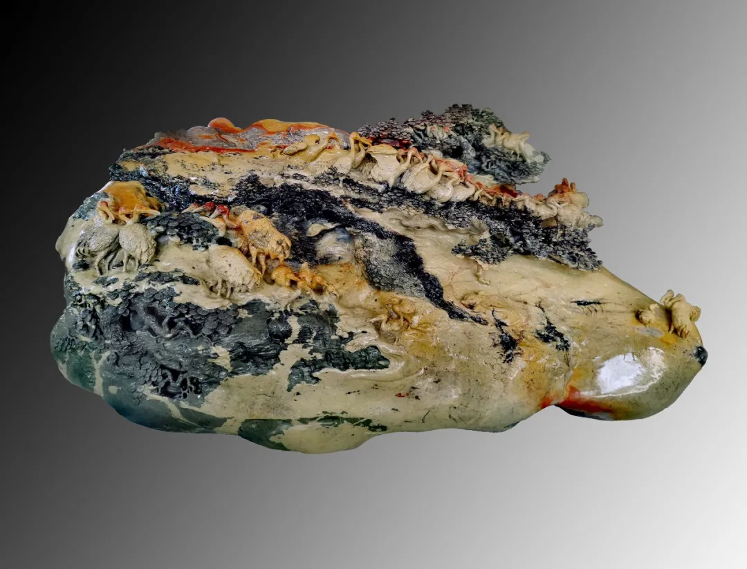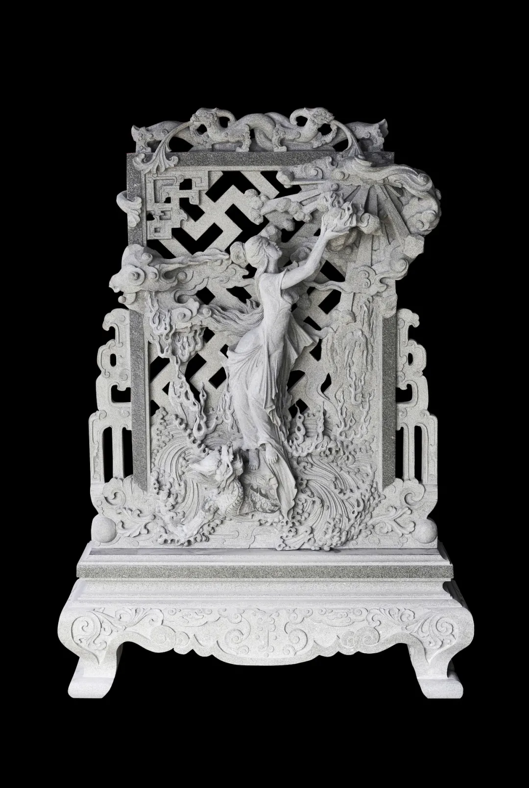 从青石、汉白玉到寿山石,王经民大师作品充分顺应石材形状、纹理等天然特性,师法自然。青石、汉白玉雕刻擅用“黑白针”技法,使得单一颜色的石材呈现出不同着色效果,色单而形不单,层次分明,极富立体感。寿山石雕刻巧用俏色,满而不溢,绷而不断,构图错落有致,疏密得当,呈现出方中有圆,意气风发的艺术效果。其作品题材丰富多样,既有传统的追述,也有时代的展现。商周的禽兽面纹,秦汉的功臣烈女、神仙百戏,隋唐的莲纹卷草、佛道器物,宋元的农商世态、灵怪传说,明清的龙凤祥瑞、戏文博古,现实题材的中国魂、惠安女等,在王经民大师的精雕细琢中,汇成世间百态。