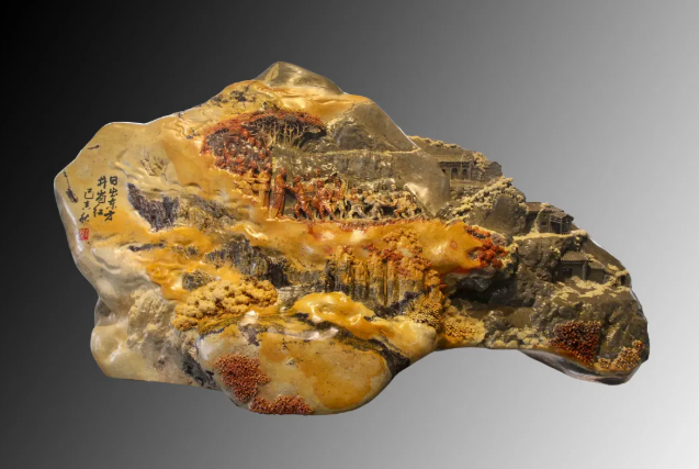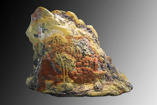 “金沙水拍云崖暖,大渡桥横铁索寒”,作品运用惠安石雕传统雕刻技法,结合寿山石俏色应用,充分展现川滇边界建筑特色,刻画了一幅革命光辉染遍祖国大地,红军战士在革命伟人英明领导和指挥下,面对波涛汹涌的金沙江慷慨激昂,不畏艰险,一往无前的景象。
