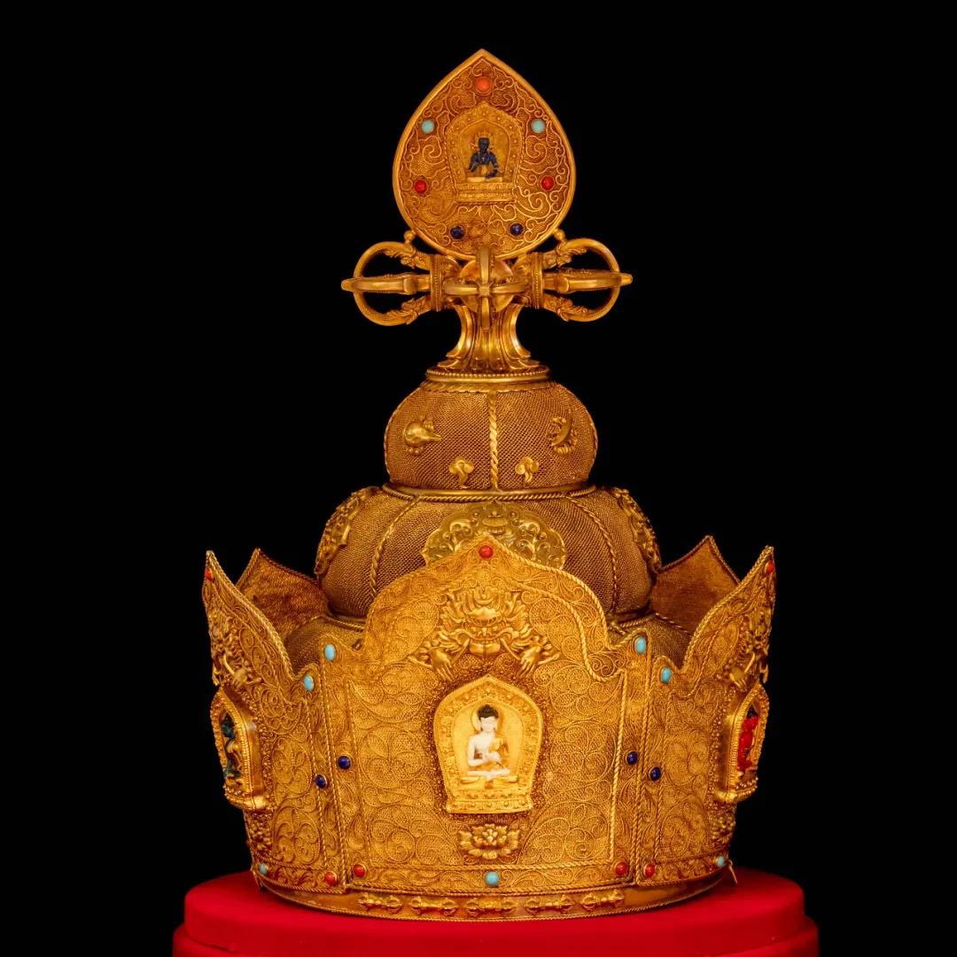 材质:银镀金 尺寸:高30cm宽20cm 重量约:1500克 五佛冠是佛教仪轨中像徵五智如来的宝冠,这件法器是银质镀金而成,采用花丝,镶嵌、錾刻等多种工艺加工而成,由五智如来和十字金刚杵等组成,工艺极为复杂。五佛冠又作五佛宝冠、五智宝冠、五宝天冠、灌顶宝冠等。因其中有五方佛形象,用以表示诸佛五智圆满之德,故得此名。佛教在修法时,往往需要佩戴五佛宝冠。此顶五佛冠共有6片冠叶,冠叶中间皆有一个佛龛,佛龛中安置五方佛等图案,表示五智圆满之德。顶部端坐大日如来,安放于十字金刚杵之上。整冠为镂空镶嵌金丝工艺,实为不可多得的佛教圣物。