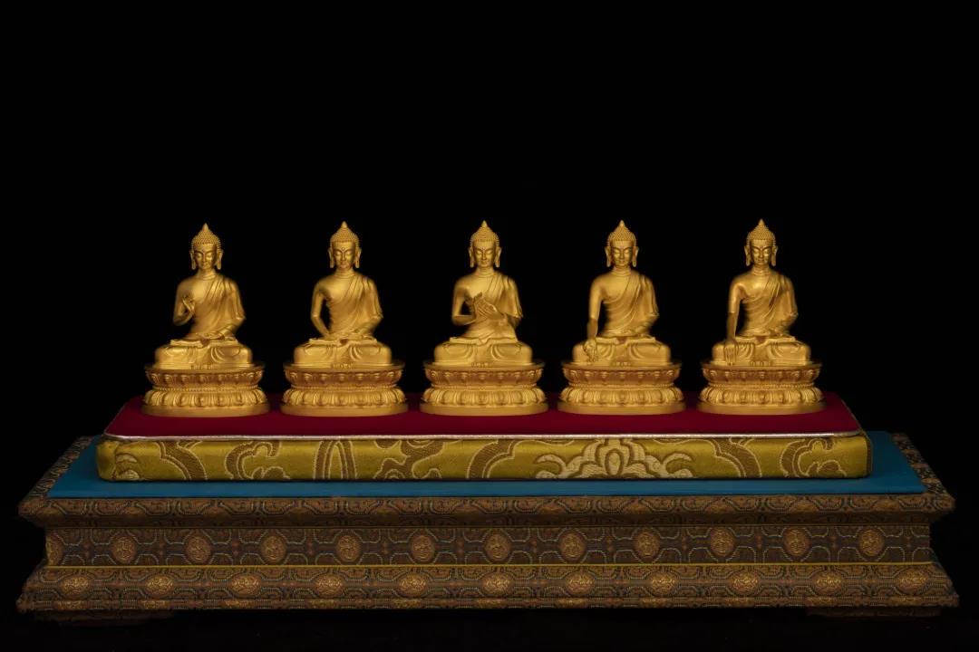五方佛又称五智佛、五方如来、五智如来,为佛教所崇奉,据唐不空三藏所译《菩提心论》记载,大日如来为教化众生,将本具之五方五智变化为五方五佛。 这组银质装金五方佛,系模仿故宫博物院梵华楼造像,为乾隆时期风格,保留些许尼泊尔遗风,头饰螺发齐整有序,眉间镶嵌钻石,神情祥和,衣纹舒展,手印各异。原本遵照梵华楼造像结全跏趺坐于双层莲台之上,后依多方意见且参照明代宫廷造像,而修改为双层仰覆莲台。又采用显微镜下之雕蜡技术等先进工艺,使小型造像更为精致。