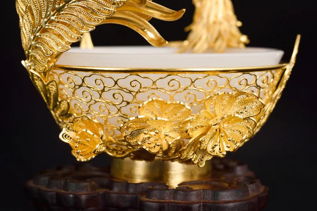 王鹏大师作品用料珍贵,以金银为底,镶嵌各类珠宝玉石,庄重大气,富丽华贵。作品制式讲究,秉承宫廷造器规制,挫、锼、捶、闷、打、崩、挤 、镶等技法并用,结构严谨,工艺考究,尽显皇家气象。作品内涵丰富,效法自然,以富贵祥和为主基调,融中华传统文化元素,集西方现代设计理念,兼收并蓄,兼容并包,中体西用,融古贯今。从他的作品中,我们可以看到一位艺术大家对中华传统手工艺的执著和坚守,对中华传统文化的传承和弘扬,看到他对世间“美”的憧憬、向往和不懈追求。