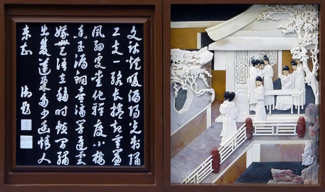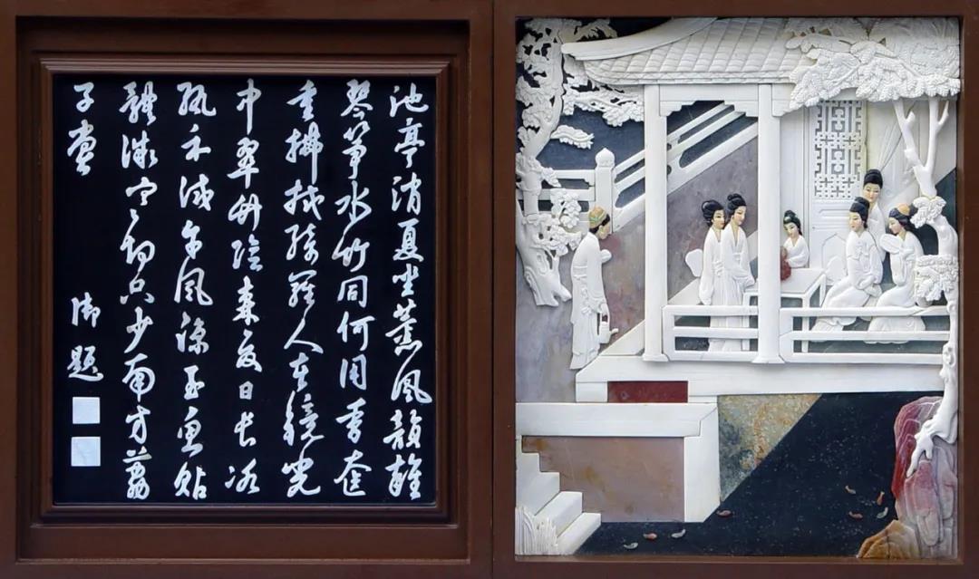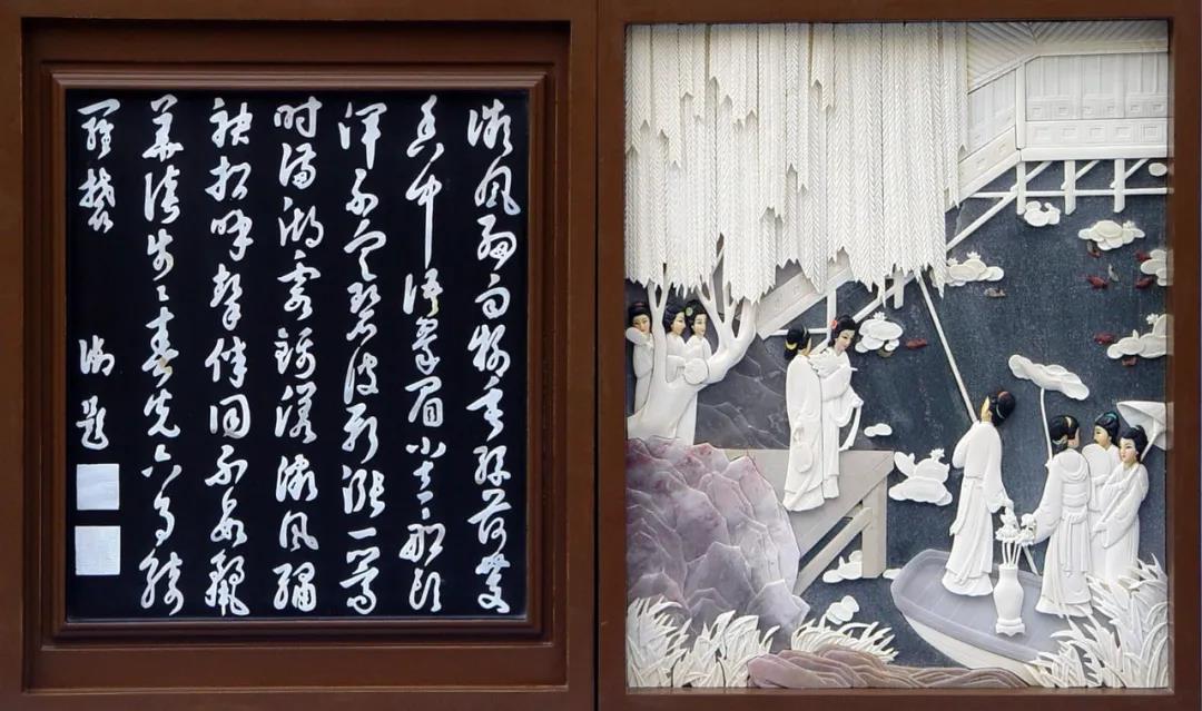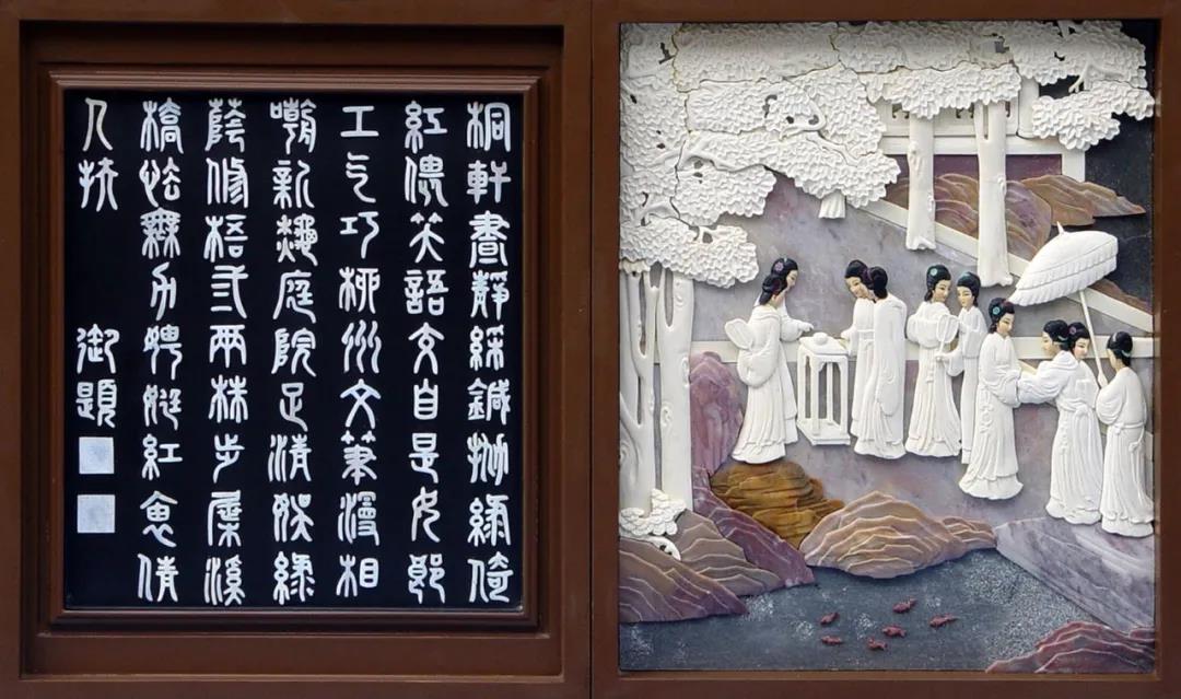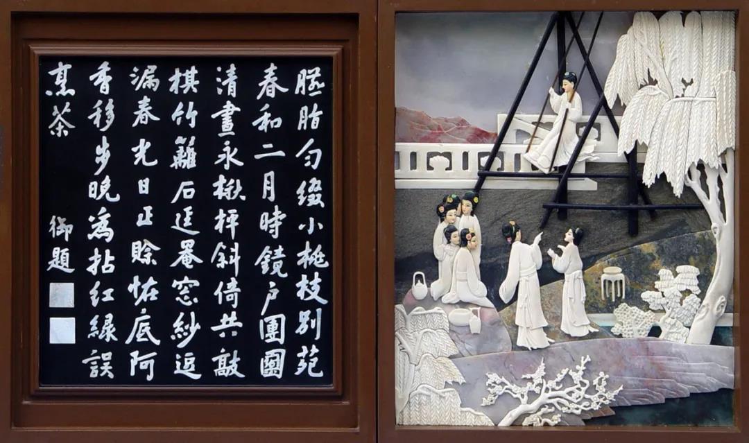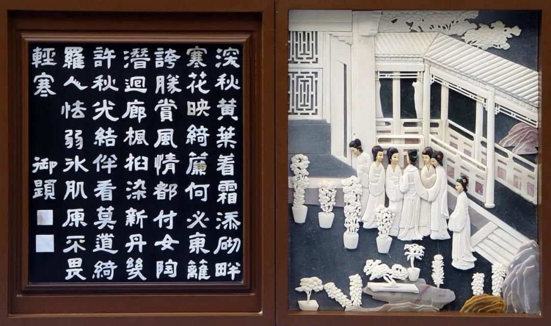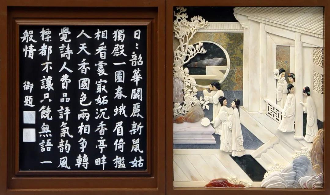 作品创意于中国古典名著《红楼梦》第三十七回:“初秋晏集诗人于风庭月榭,醉飞吟盏于帘香溪桃”,创作红楼十二钗人物吟诗的美景,以写实手法还原诗句的意境,淑女佳人温文尔雅,亭台楼阁华美壮观。作品用料讲究,采用天然软、硬玉石材料,海南黄花梨、紫檀、金、银等十几种名贵材料,集百宝嵌之大成,采用了平嵌、矫嵌工艺技法,做工精细,堆嵌严谨,磨退光亮,雕刻玲珑,格调高雅。