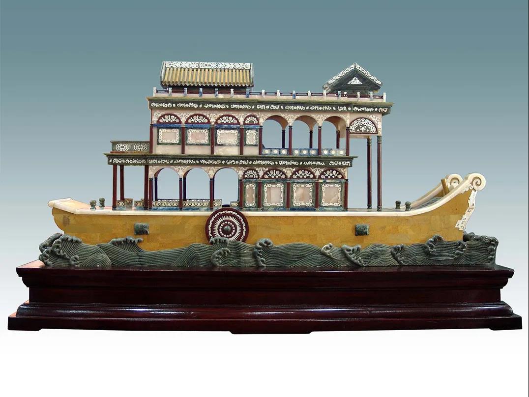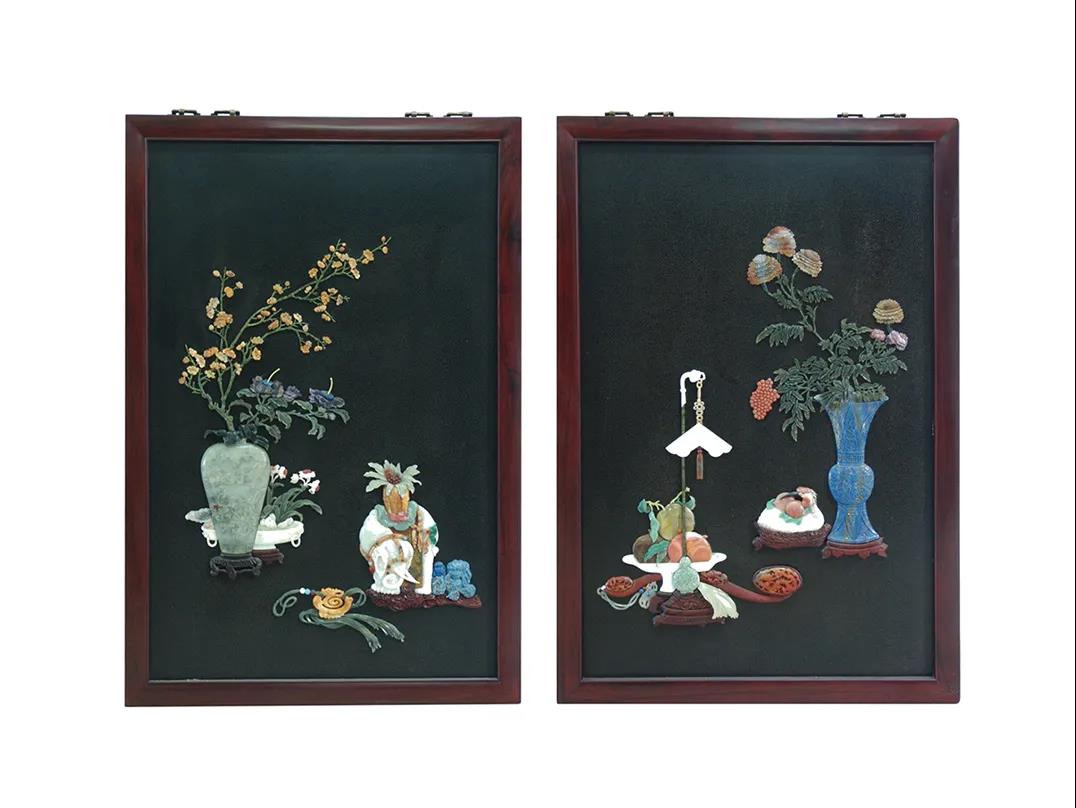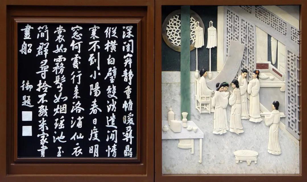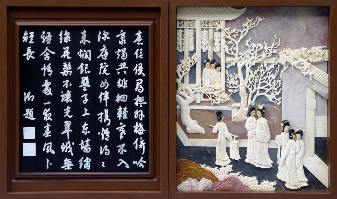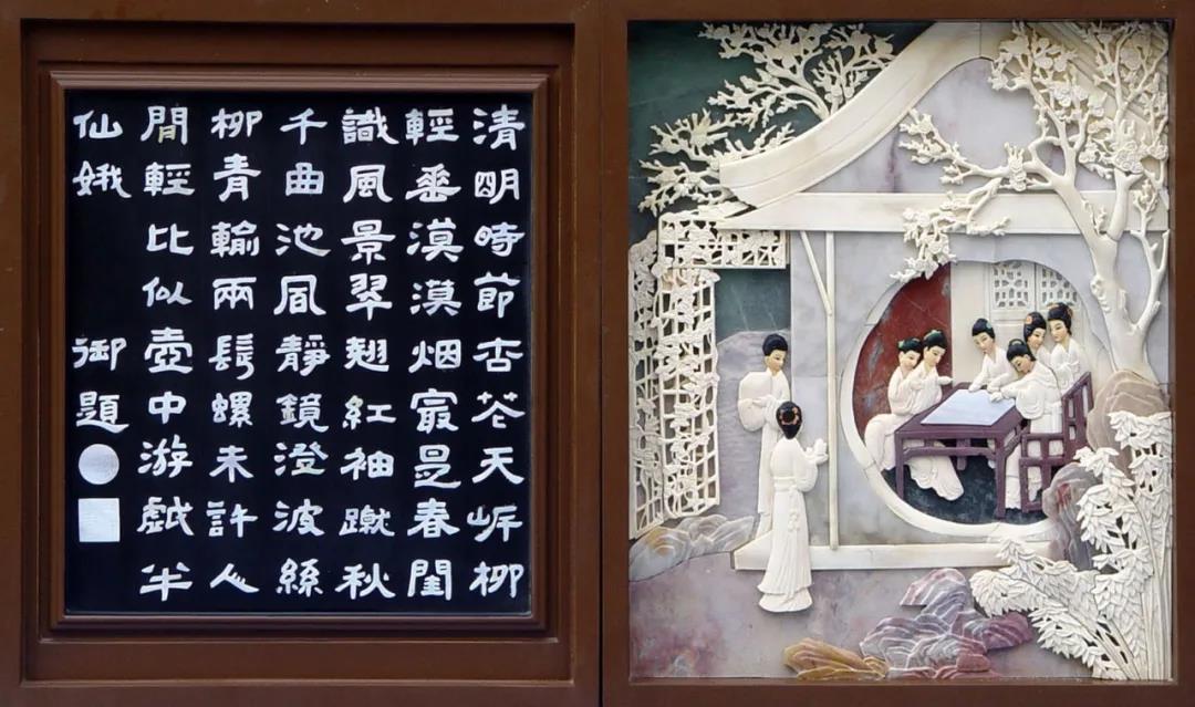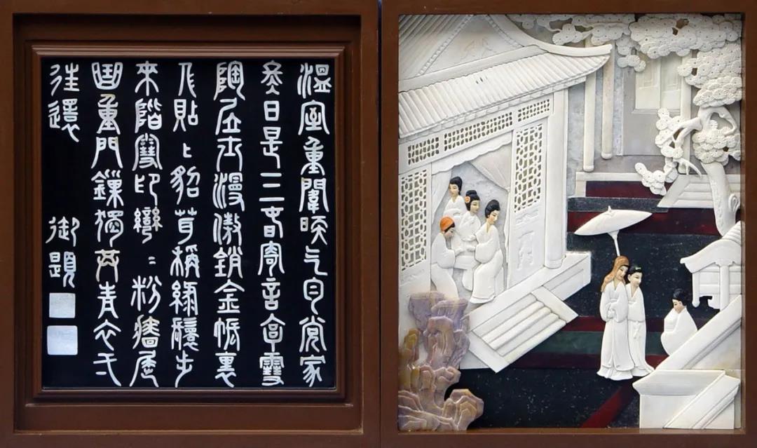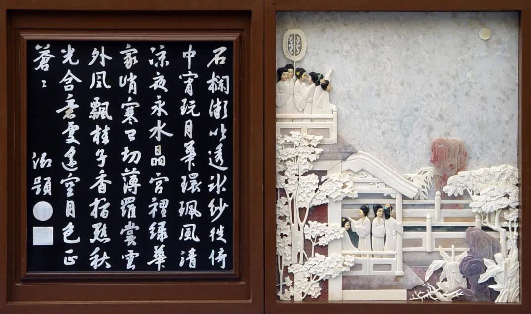 作品创意于中国古典名著《红楼梦》第三十七回:“初秋晏集诗人于风庭月榭,醉飞吟盏于帘香溪桃”,创作红楼十二钗人物吟诗的美景,以写实手法还原诗句的意境,淑女佳人温文尔雅,亭台楼阁华美壮观。作品用料讲究,采用天然软、硬玉石材料,海南黄花梨、紫檀、金、银等十几种名贵材料,集百宝嵌之大成,采用了平嵌、矫嵌工艺技法,做工精细,堆嵌严谨,磨退光亮,雕刻玲珑,格调高雅。