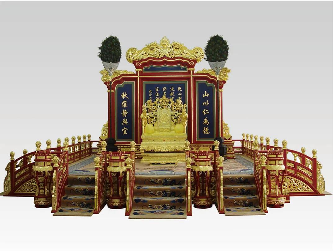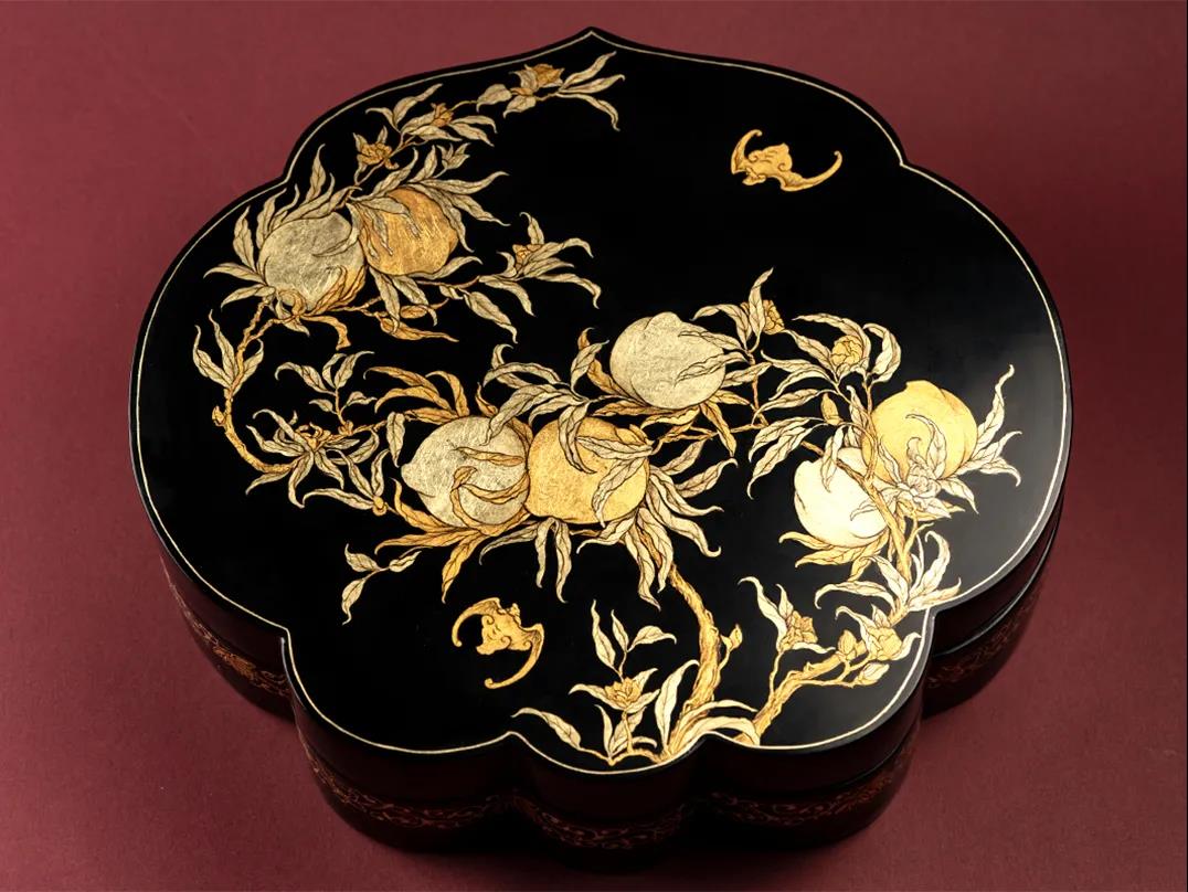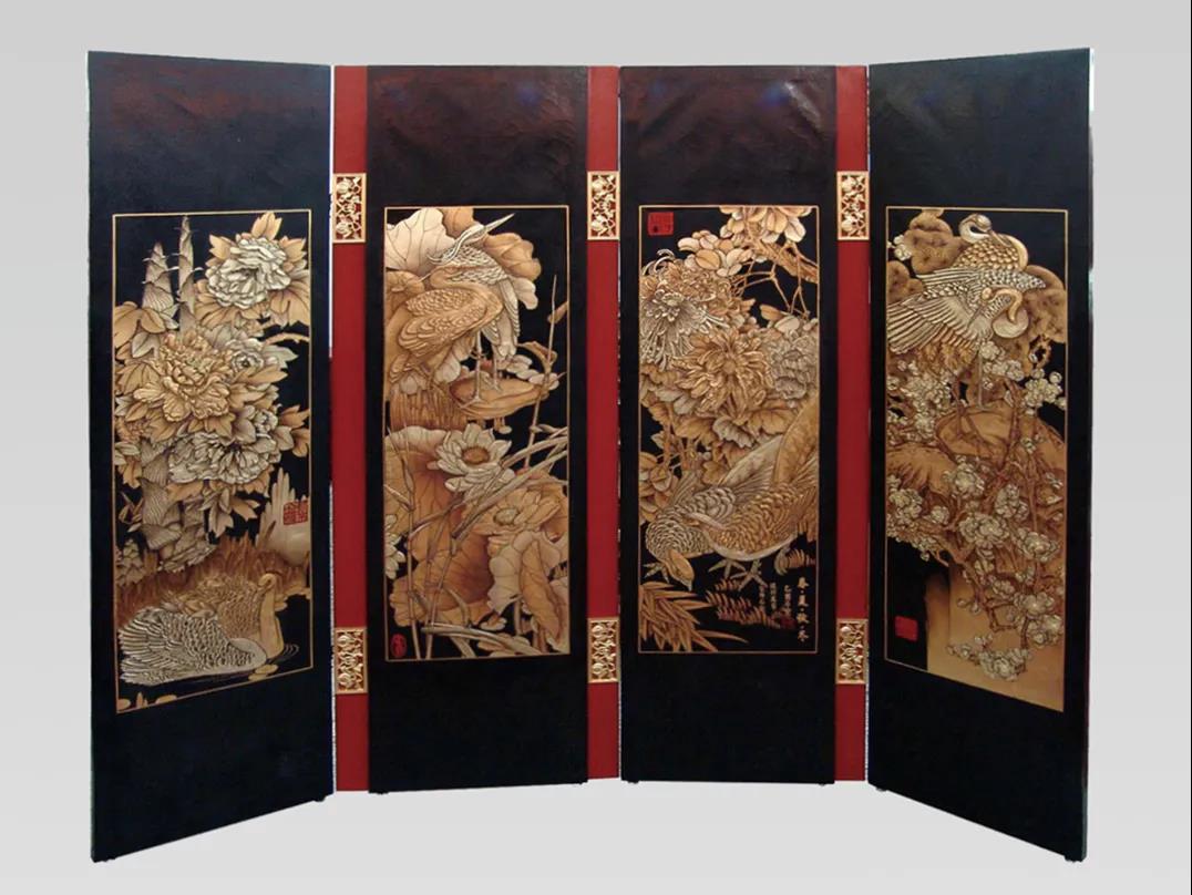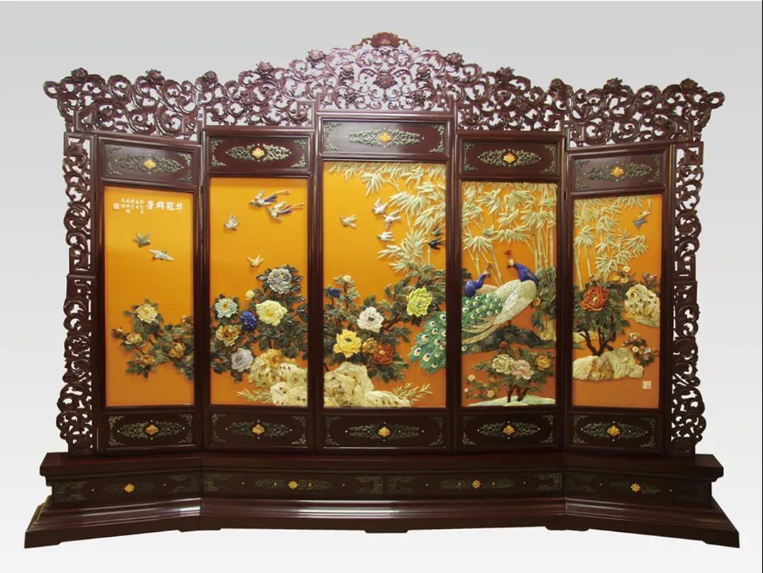 作品以牡丹与和平鸽为题,四周装饰和平鸽雕刻造型,与传统牡丹纹样相结合,表达祈求和平的寓意。饰面采用金漆镶嵌传统技法之金髹描绘、晕金和扫金工艺制作,描画精致细腻,金箔光亮,晕染娴熟,做工精湛,色彩艳丽。