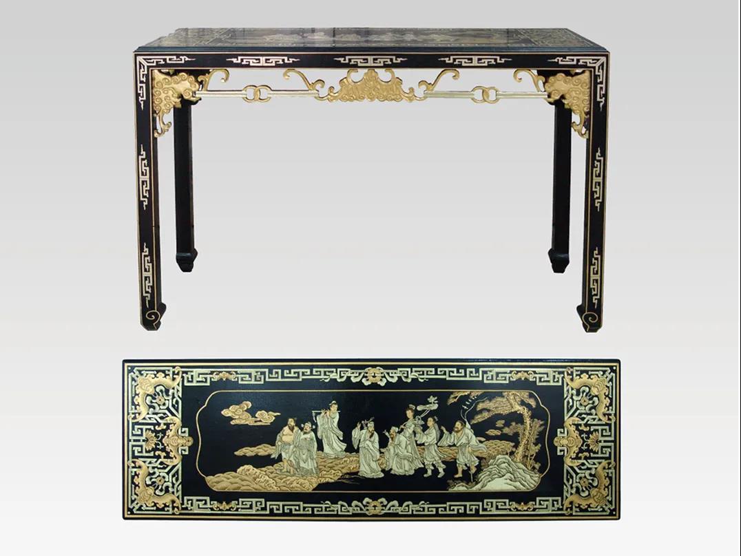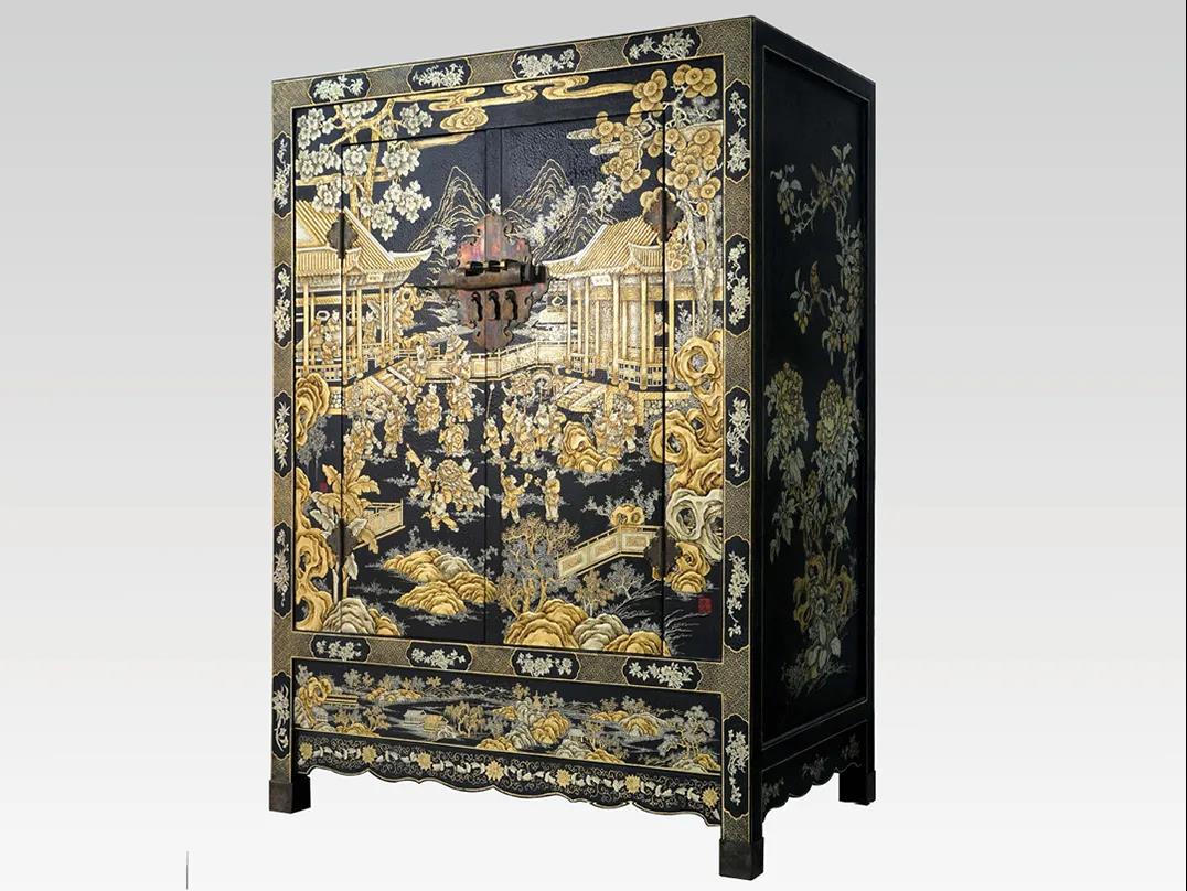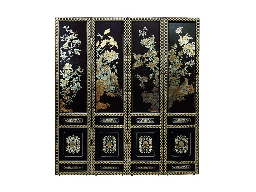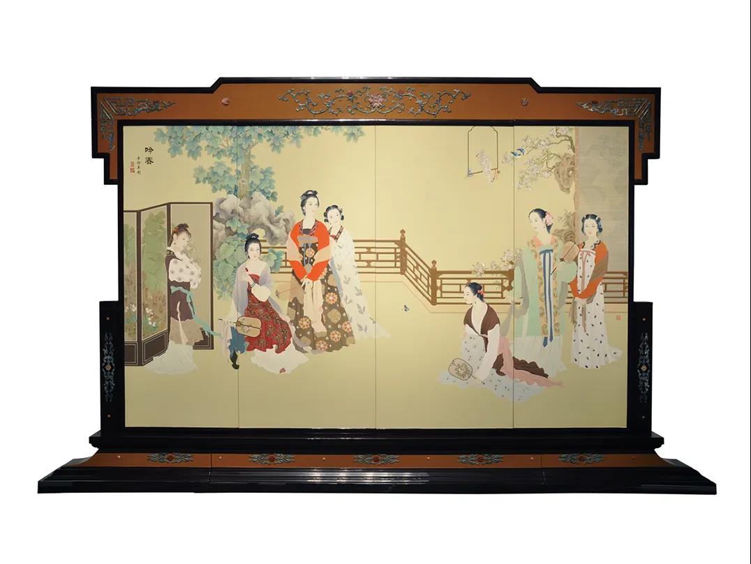 万紫大师作品题材广泛,用料讲究,器型多变,工巧材美,颇具匠心。屏风、条案、提盒、挂屏、圆盘、漆箱、漆壶等,皆以金漆镶嵌技艺髹饰,融传统制作工艺和现代设计理念,或浓墨重彩,富丽堂皇,延承宫廷风格,尽显皇家气象;或典雅隽秀,质朴简约,颇具现代格调。作品似画非画而更胜于画,一砖一瓦,一草一木,行刀流畅细腻,细节刻画精准到位;一言一动,一颦一笑,人物神情姿态描摹生动形象,惟妙惟肖;苍松翠柏,牡丹玫瑰,亭台楼阁,湖光山色,或明或暗,或远或近,错落有序,凹凸有致,层次分明,透视效果强,极富立体感。万紫大师凭借着这一刀一刻、一描一贴,使山水花鸟、万千人物和古今往事,焕发出无限光彩和新的生机。